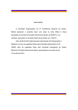 1) O documento apresenta o tema e os eixos da IV Conferência Nacional de Saúde Mental, que discutirá a política de saúde mental no Brasil.