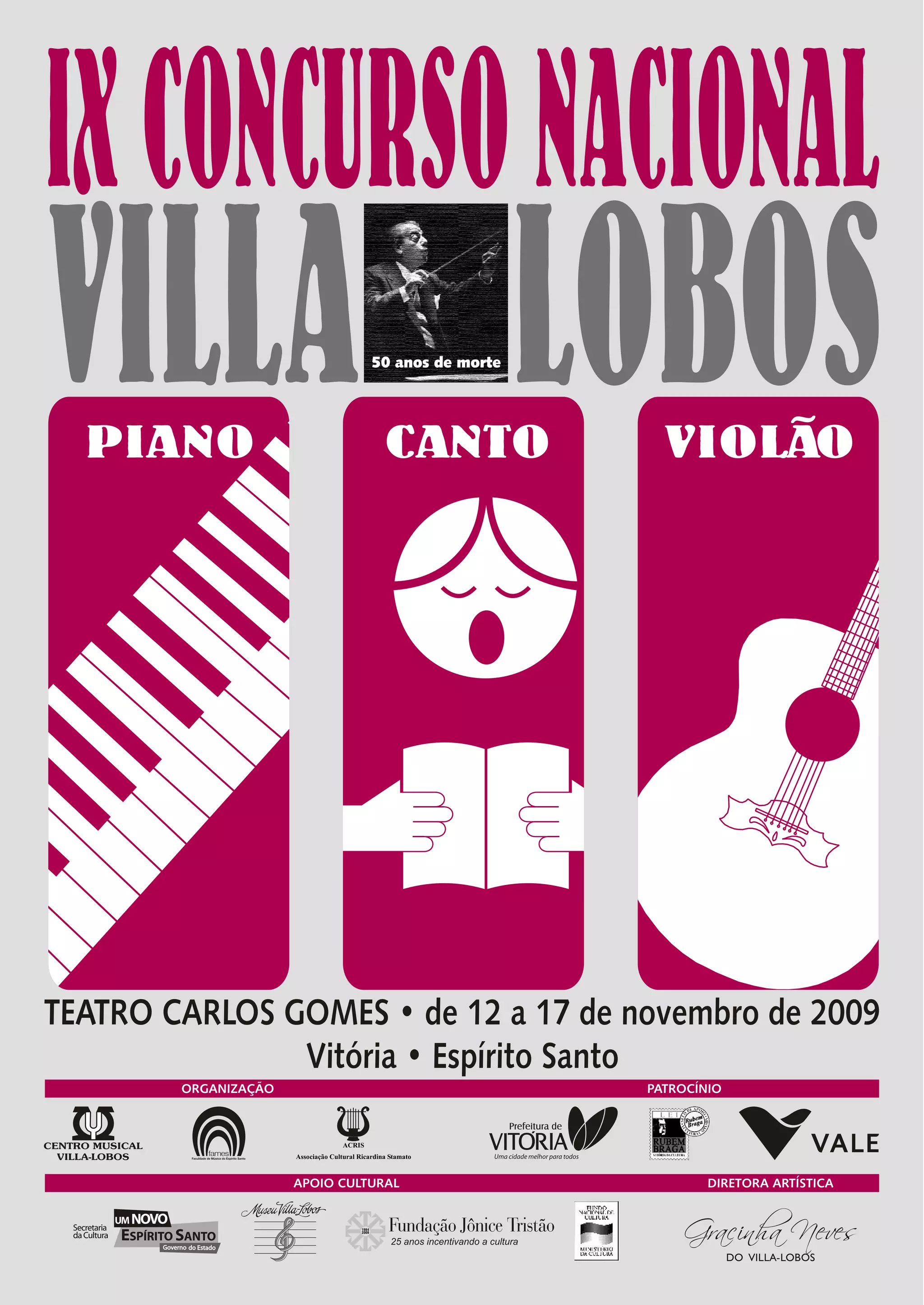 O documento descreve o IX Concurso Nacional Villa-Lobos, que ocorrerá de 12 a 17 de novembro de 2009 em Vitória, ES. O concurso homenageará os 50 anos da morte do compositor Villa-Lobos e incluirá categorias para piano, canto e violão. O regulamento define as regras de inscrição, programação, júri e premiação.