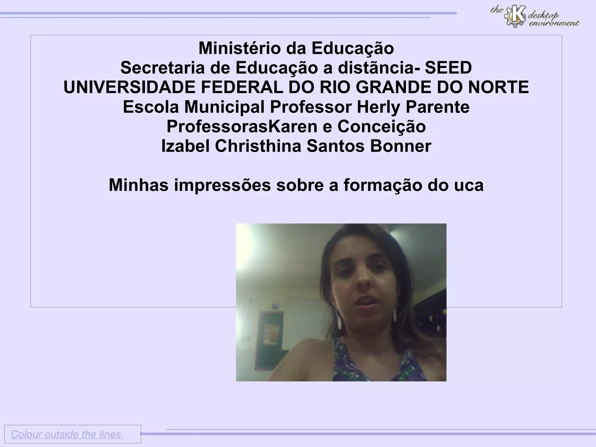 O documento discute as impressões de uma professora sobre a formação do programa UCA. Ele identifica duas dificuldades principais: a necessidade de mais encontros de formação e problemas com o programa Metasys. Duas vantagens são apontadas: o uso de jogos pedagógicos e o UCA como recurso valioso para os alunos. Duas sugestões são fornecidas: mais apoio na sala de aula durante as aulas do UCA e formação contínua para os professores.