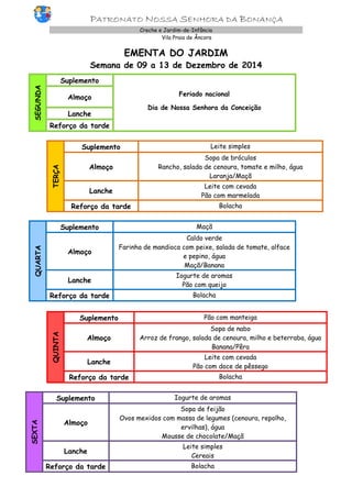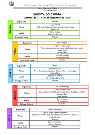 Este documento apresenta o cardápio semanal de uma creche e jardim-de-infância, incluindo as refeições, lanches e reforços servidos de 01 a 02 de janeiro de 2015. A ementa inclui sopas, pratos de carne, peixe ou ovos, acompanhamentos de saladas e legumes, frutas e lacteos para lanches.