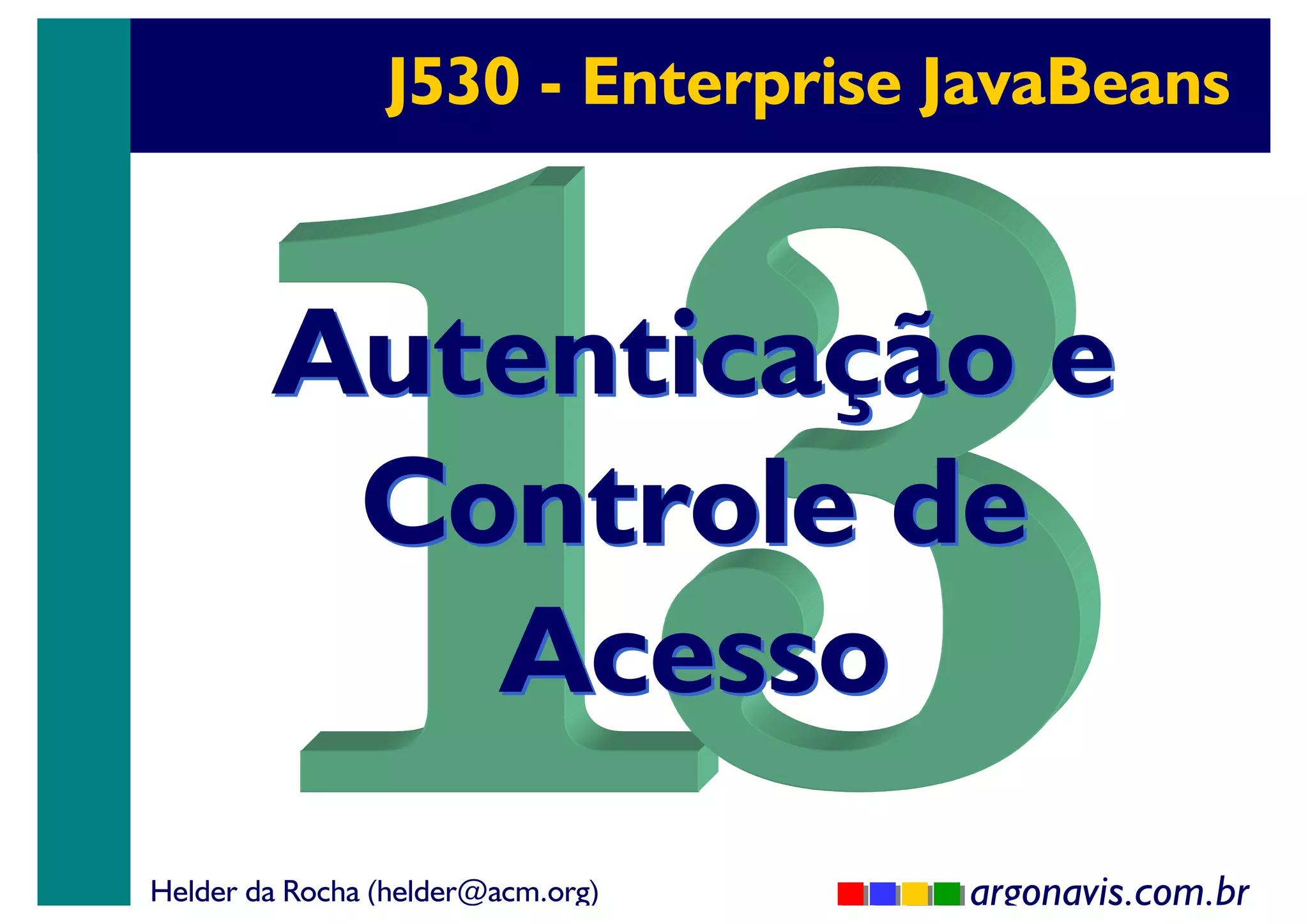 O documento descreve os conceitos de autenticação e controle de acesso em EJB. A especificação EJB define autenticação de clientes e controle de acesso a métodos de forma declarativa, mas não abrange outros aspectos de segurança. O Java Authentication and Authorization Service (JAAS) é usado para implementar a autenticação, enquanto papéis lógicos mapeados a usuários e grupos determinam o acesso aos métodos.