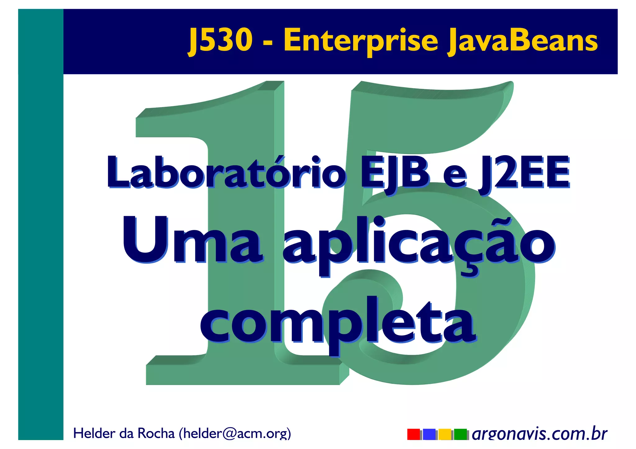 Este documento descreve uma aplicação J2EE completa como exemplo para um laboratório sobre EJB e J2EE. A aplicação simula uma loja online simples com relacionamentos entre entidades como Produto, Cliente e Compra. Inclui entity beans, session beans, message-driven beans, tabelas no banco de dados, interfaces, deploy e testes de clientes.