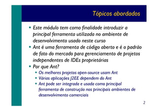 O documento introduz a ferramenta Apache Ant, que é usada para gerenciar projetos Java de forma automatizada através de arquivos XML. Ant permite compilar, empacotar, testar e implantar aplicações de forma independente de IDEs. Ele executa tarefas como compilação, geração de documentação e empacotamento usando roteiros definidos em arquivos XML chamados buildfiles.