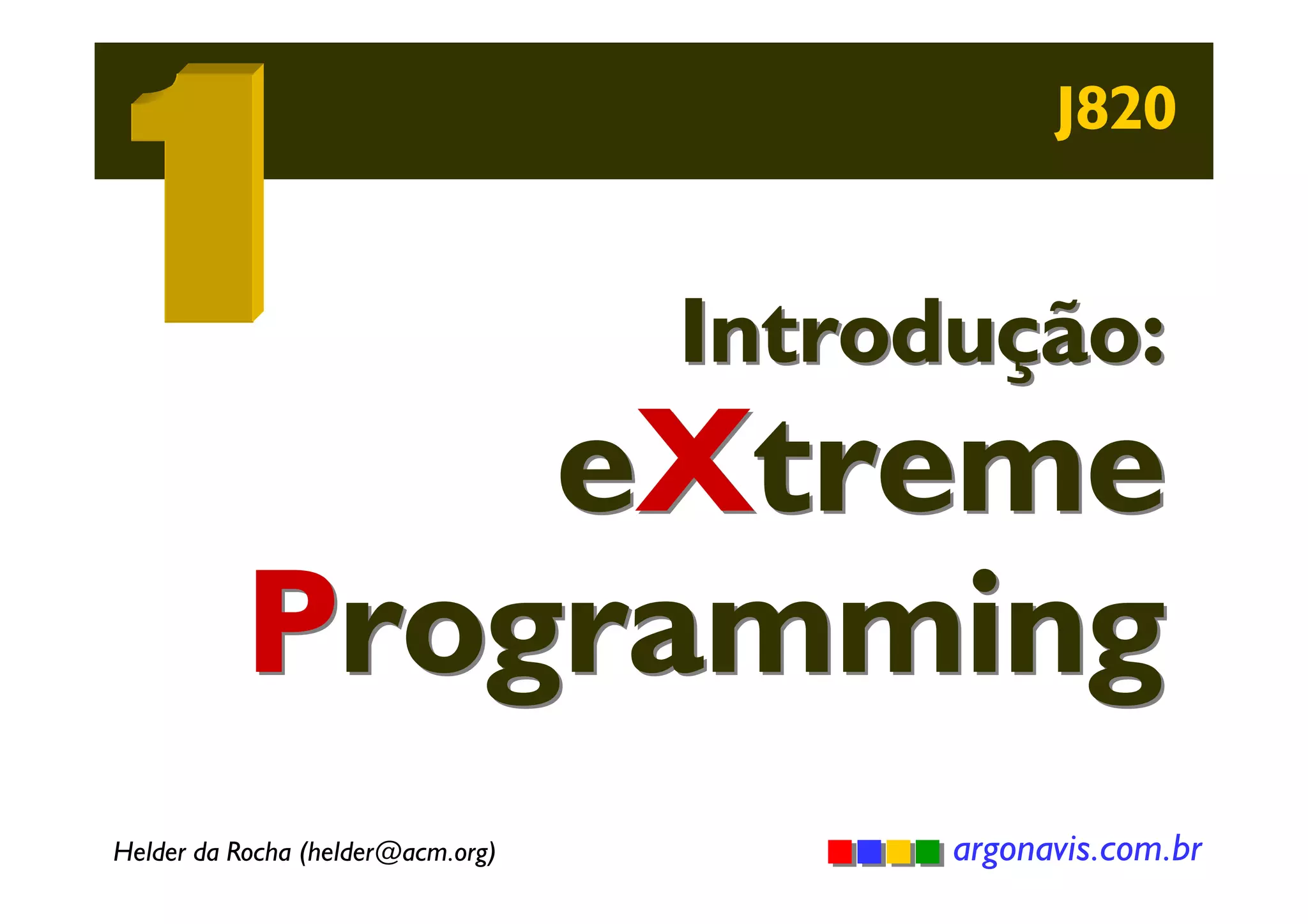 O documento introduz a metodologia eXtreme Programming (XP) e suas principais práticas ágeis. XP enfatiza a comunicação, simplicidade, feedback e coragem por meio de práticas como programação em pares, testes automatizados, integração contínua, refatoramento e pequenos lançamentos frequentes. O objetivo é entregar valor ao cliente de forma incremental e adaptável a mudanças.
