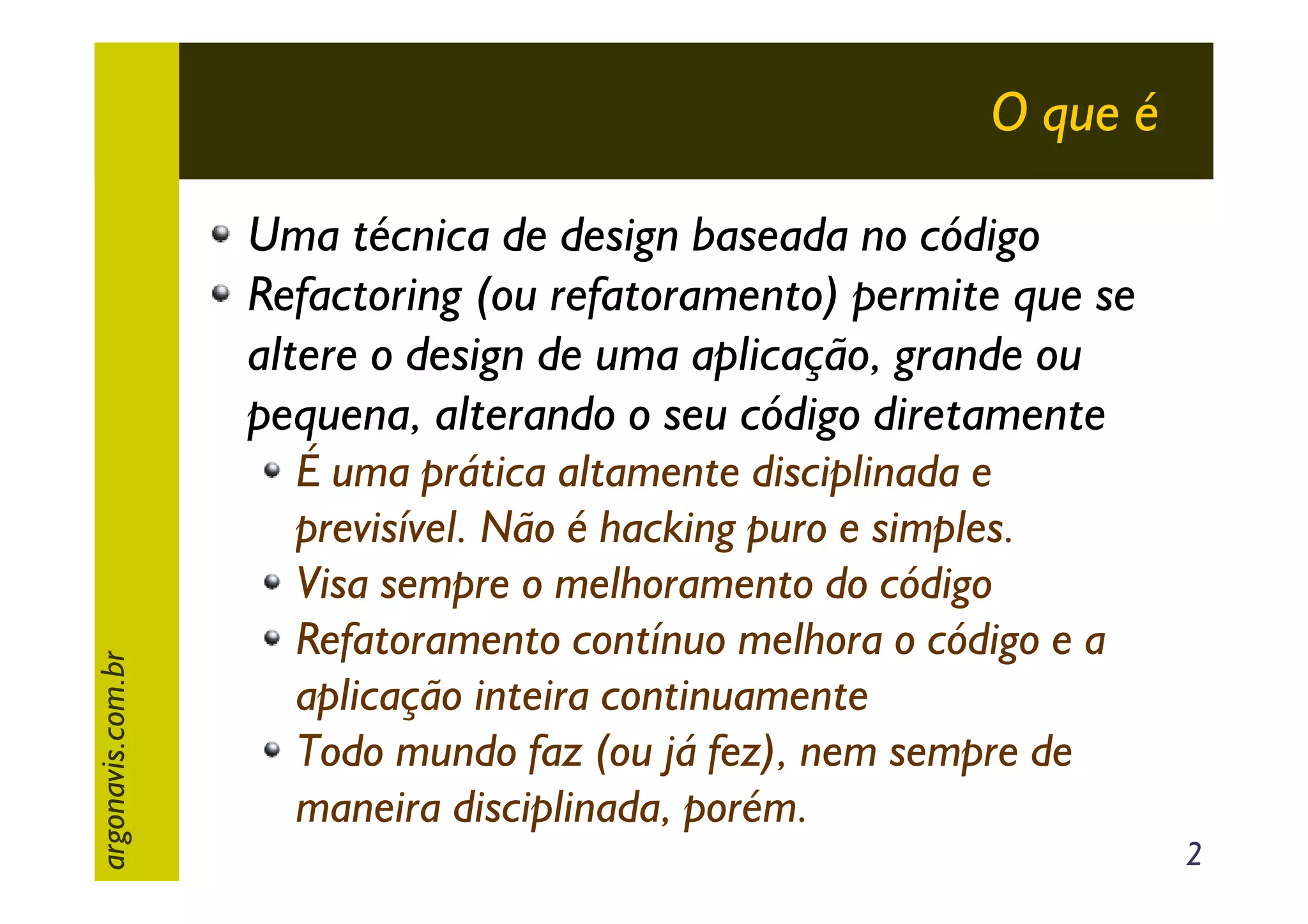 O documento aborda a prática de refatoração de código, destacando sua importância para melhorar o design e a qualidade das aplicações. Refatoramentos devem ser aplicados com cuidado, preferencialmente acompanhados de testes unitários, e envolvem diversas técnicas e padrões de projeto. Exemplos de refatorações e estratégias para aplicá-las são apresentados, além de um catálogo de refatoramentos do renomado autor Martin Fowler.