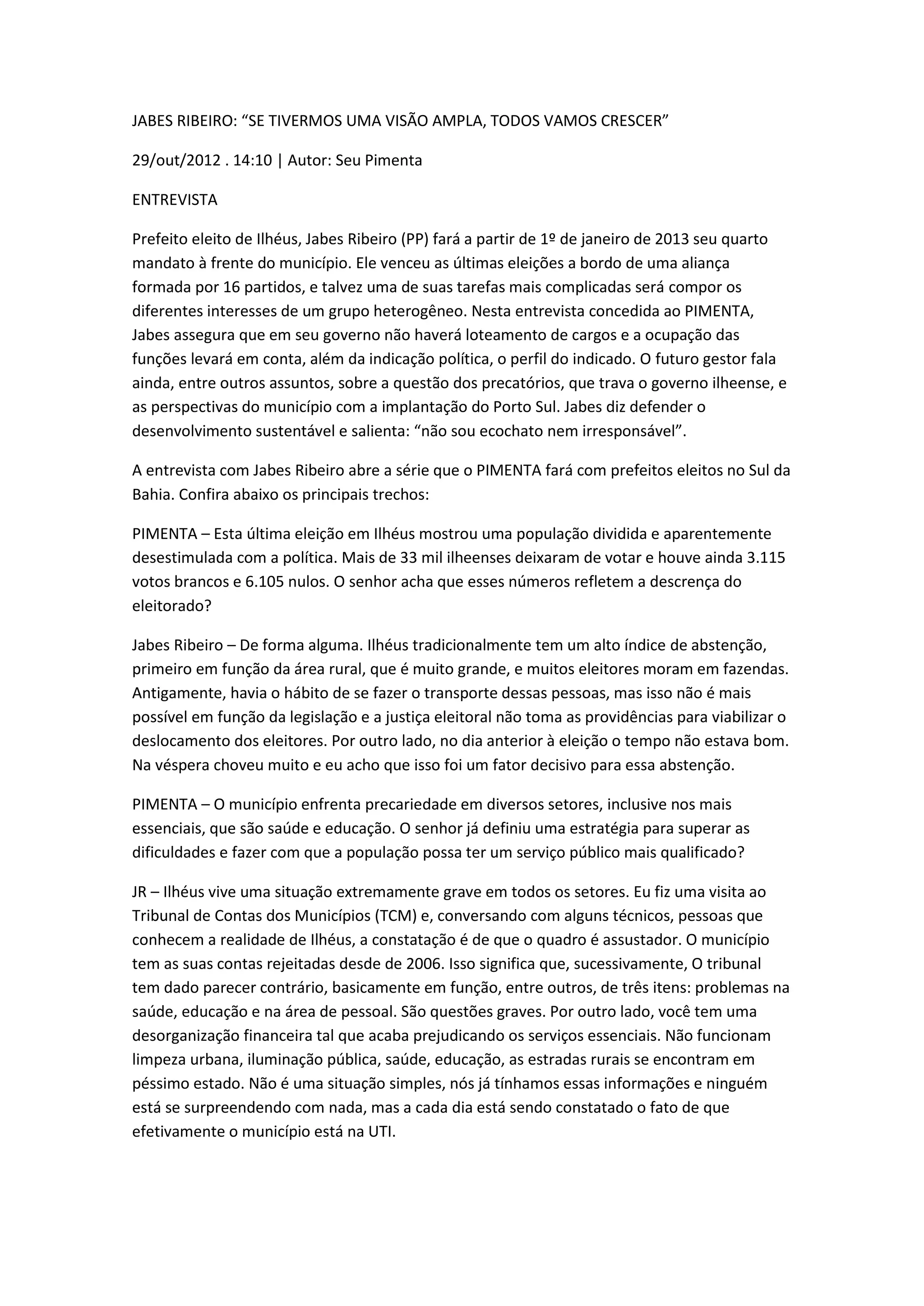 A entrevista discute os desafios que o prefeito eleito de Ilhéus, Jabes Ribeiro, enfrentará em seu quarto mandato, incluindo a precariedade nos serviços públicos, a dívida em precatórios e a necessidade de definir prioridades para recuperar a cidade. Jabes planeja realizar uma auditoria, negociar dívidas e melhorar a administração para resolver os problemas financeiros e melhorar a qualidade dos serviços à população.