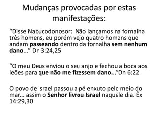 O documento descreve manifestações divinas na Bíblia que trouxeram mudanças, como os três hebreus na fornalha e Daniel na cova dos leões. Também fala sobre o sonho de Deus para Jacó, que era maior do que o sonho de Jacó. Discute como as pessoas passaram do temor à adoração a Deus e da incredulidade à fé ao entenderem Sua perspectiva correta. Conclui que a questão é saber se estamos subindo a escada certa.