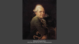 O documento lista as obras do pintor francês Jacques-Louis David ao longo de sua carreira, desde retratos individuais e familiares até grandes pinturas históricas e alegóricas, muitas das quais foram exibidas no Salon de Paris. As obras tratam de temas mitológicos, históricos e contemporâneos, retratando figuras como Napoleão e eventos da Revolução Francesa. Muitas das pinturas encontram-se atualmente em importantes museus europeus como o Louvre.
