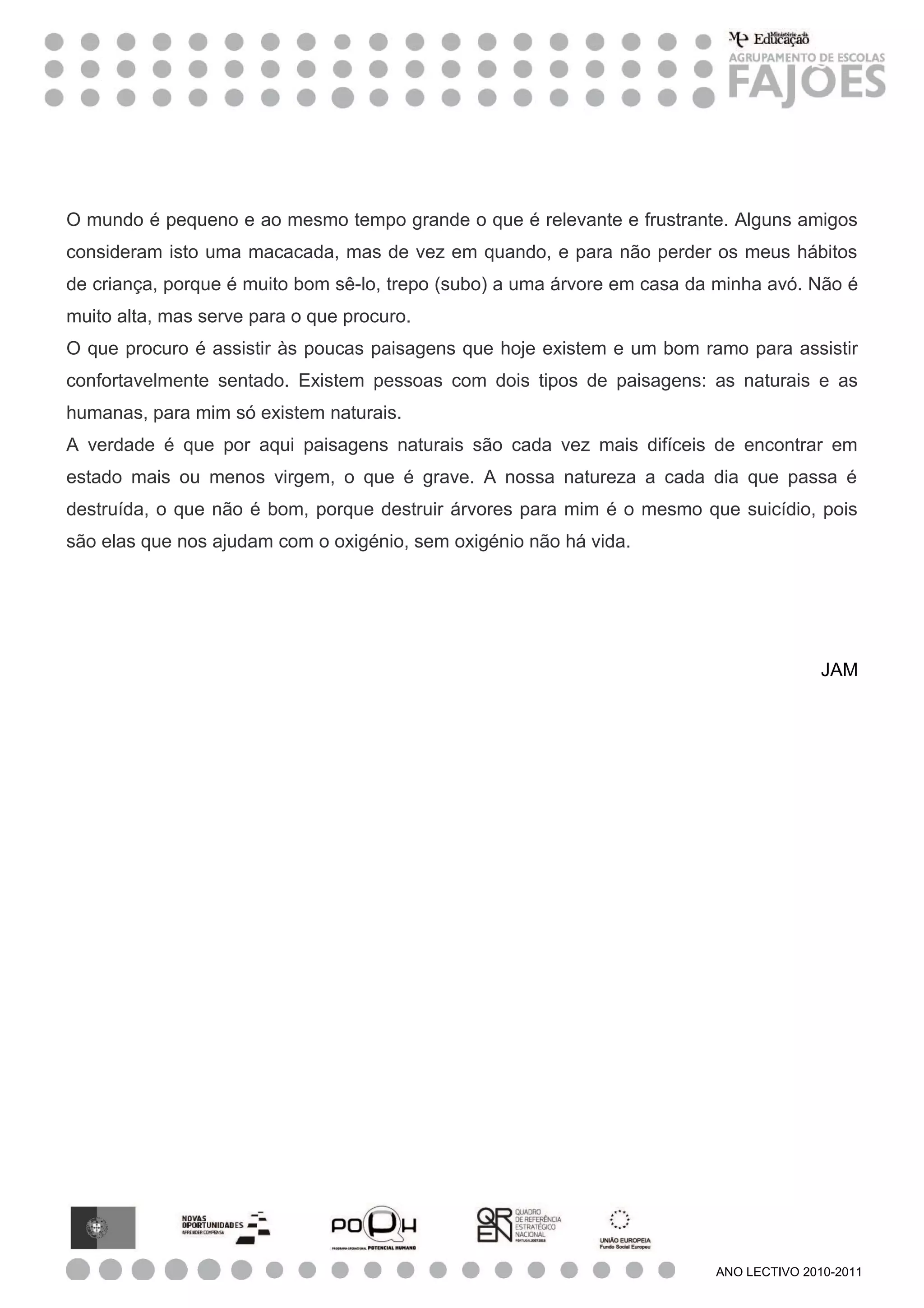 O documento descreve como o autor gosta de subir em uma árvore na casa de sua avó para observar as poucas paisagens naturais remanescentes. Ele acredita que apenas paisagens naturais importam e que a destruição da natureza equivale ao suicídio, já que as árvores fornecem oxigênio vital para a vida.