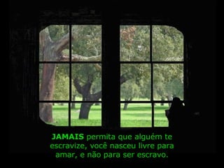 O documento lista uma série de coisas que nunca se deve permitir em um relacionamento amoroso, como se deixar escravizar, sofrer ou chorar por alguém, ter seu nome pronunciado em vão, ou permitir que a dor e o ódio tirem o brilho de seus olhos.