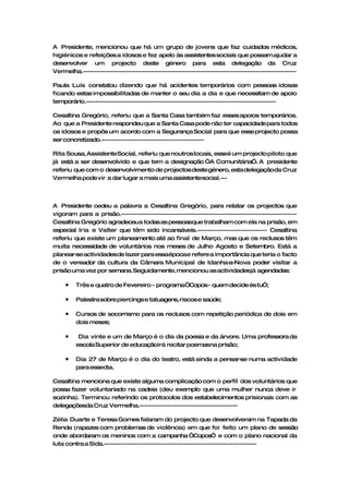 A ata da reunião ordinária de voluntários da Cruz Vermelha Portuguesa de Castelo Branco de 29 de janeiro de 2010 resume: (1) a nomeação de Iria Moura como nova coordenadora de emergência local; (2) a discussão sobre o desenvolvimento de um projeto de apoio a idosos; (3) as atividades planejadas para o estabelecimento prisional de Castelo Branco até março de 2010.