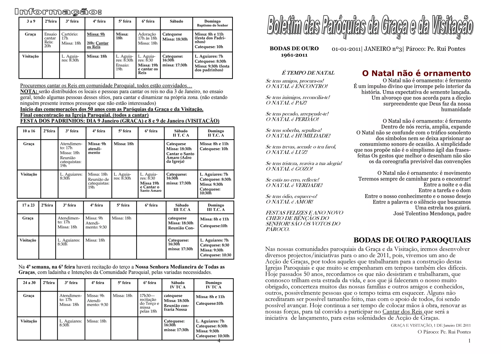 O documento apresenta o calendário de atividades religiosas em duas paróquias para o mês de janeiro, incluindo missas, catequeses, adorações e outras celebrações. Também anuncia as comemorações dos 50 anos das paróquias com várias iniciativas ao longo do ano para agradecer aqueles que construíram as igrejas.