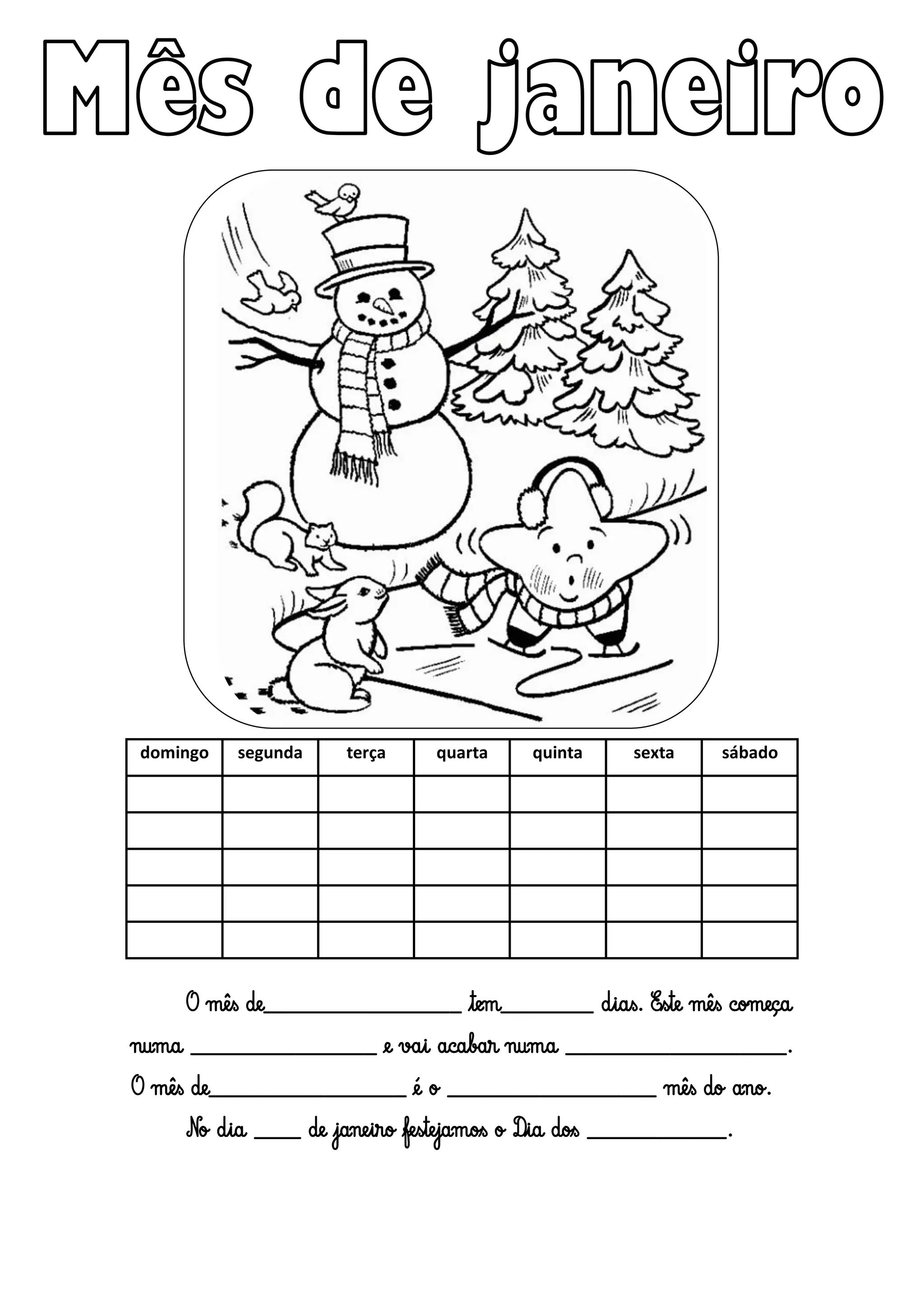 O documento fornece um modelo para preencher informações sobre um mês genérico, incluindo o número de dias, os dias da semana em que começa e termina, a posição no ano e feriados celebrados.