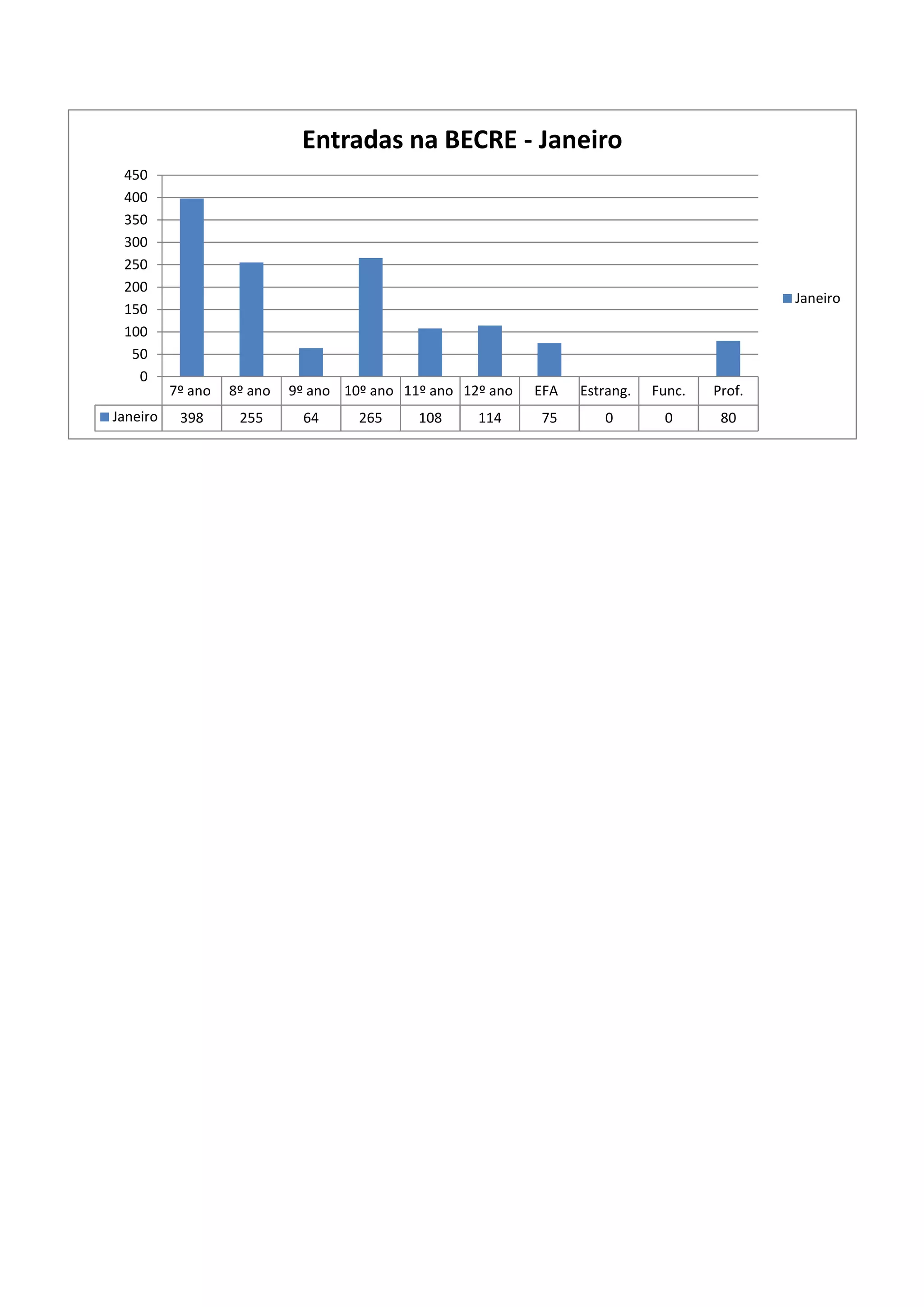 O gráfico mostra o número de matrículas por nível de ensino na BECRE em janeiro. A maioria das matrículas foi para o 7o ano com 398, enquanto o 8o ano teve 255 matrículas e o 10o ano teve 265 matrículas.