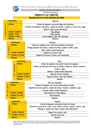 Este documento contém as ementas semanais da creche e jardim-de-infância Patronato Nossa Senhora da Bonança em Vila Praia de Âncora, com as refeições, lanches e suplementos servidos às crianças de diferentes grupos entre as semanas de 04 a 29 de janeiro de 2016. As ementas incluem pratos como cremes de legumes, sopas, peixe, carne e arroz, acompanhados de saladas, frutas e bolachas.