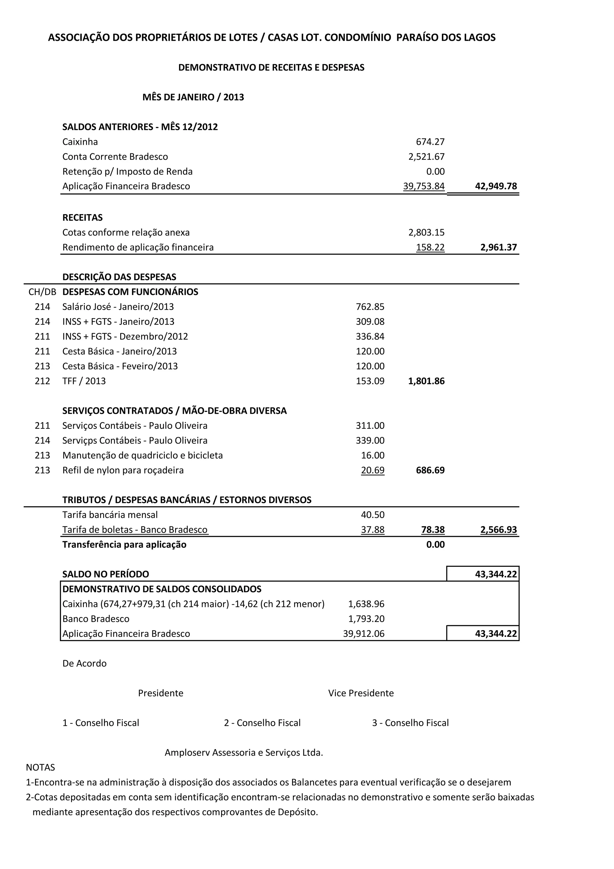 O documento apresenta o demonstrativo de receitas e despesas do Condomínio Paraisó dos Lagos referente ao mês de janeiro de 2013. As receitas totalizaram R$2.961,37 provenientes de cotas e rendimentos financeiros. As despesas somaram R$2.566,93, incluindo salários, serviços contábeis, manutenção e tributos. O saldo final no período foi de R$43.344,22.