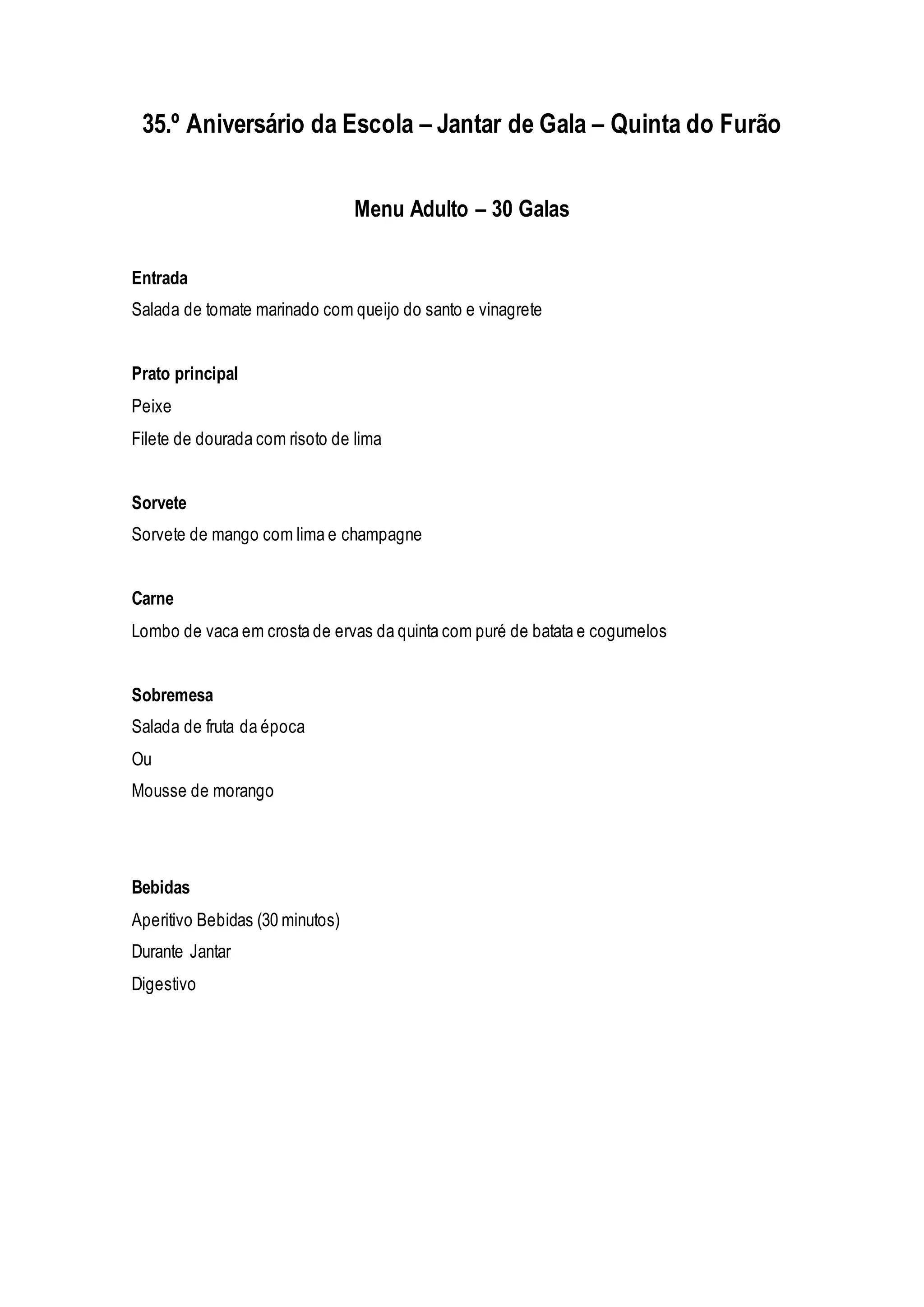 O documento descreve o menu de um jantar de gala para comemorar o 35o aniversário de uma escola. O menu adulto inclui entrada de salada de tomate, pratos principais de peixe ou carne e sobremesa de salada de fruta ou mousse de morango. O menu infantil oferece minipizzas, peixe ou hambúrguer como prato principal e mousse de chocolate ou fruta como sobremesa.