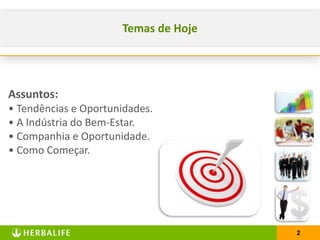 O documento discute as tendências e oportunidades no mercado de bem-estar e qualidade de vida. Apresenta a indústria do bem-estar como uma das maiores tendências de mercado, com grandes fortunas sendo construídas. Também descreve a Herbalife como uma oportunidade de negócio nesse mercado em crescimento, com diferentes formas de ganho para distribuidores.