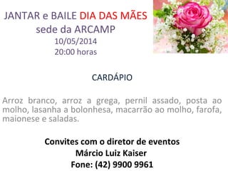 Um jantar e baile serão realizados no dia das mães na sede da ARCAMP, com início às 20h, oferecendo pratos como pernil assado, lasanha e saladas. Os convites podem ser obtidos entrando em contato com o diretor de eventos Márcio Luiz Kaiser pelo telefone (42) 9900 9961.
