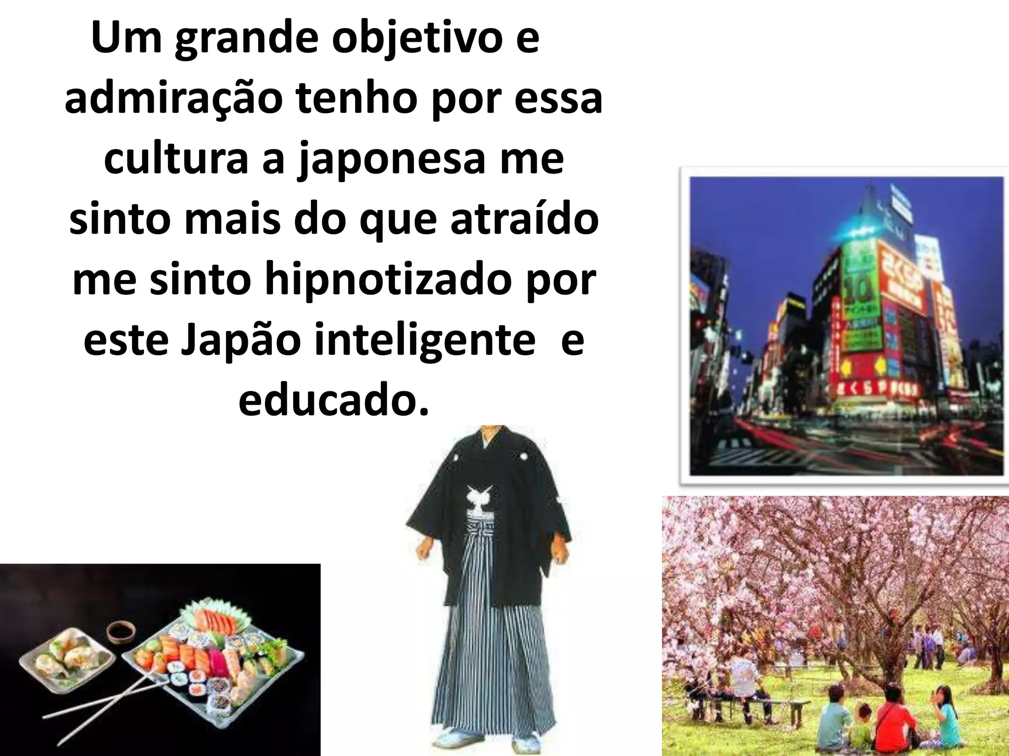 Um grande objetivoe admiração tenho por essa cultura a japonesa me sinto mais do que atraído me sinto hipnotizado por este Japão inteligente e educado.