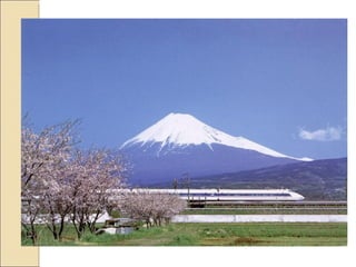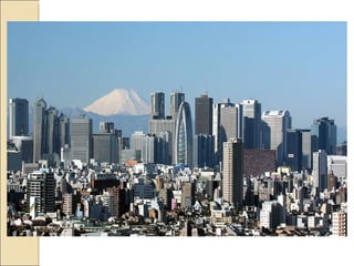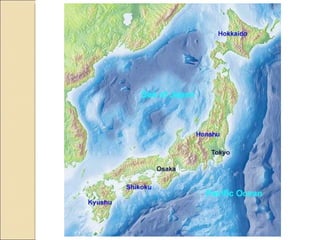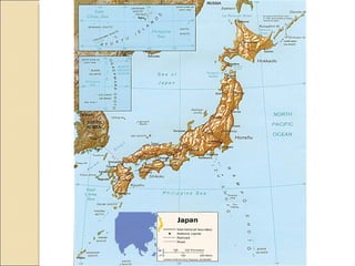 O documento fornece informações sobre a geografia, história, política, economia e cultura do Japão. Em particular, descreve a localização do país como um arquipélago montanhoso na Ásia Oriental, sua dinastia imperial secular, a transição para uma economia industrializada após a era Meiji e a atual concentração populacional e industrial na megalópole de Tóquio-Osaka.