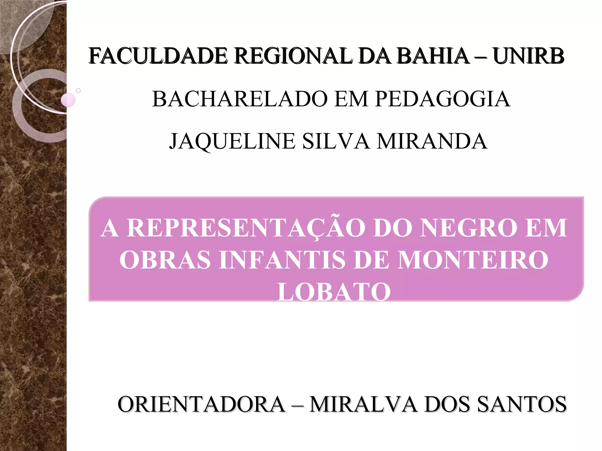 O documento apresenta uma pesquisa sobre a representação do negro em obras infantis de Monteiro Lobato. Após a introdução e justificativa, descreve os objetivos e metodologia da pesquisa. A seguir, resume o conteúdo de cada um dos três capítulos propostos para a estrutura do trabalho, abordando a literatura infantil, a biografia de Lobato e a análise da representação do negro em suas obras. Por fim, apresenta considerações finais e referências bibliográficas.