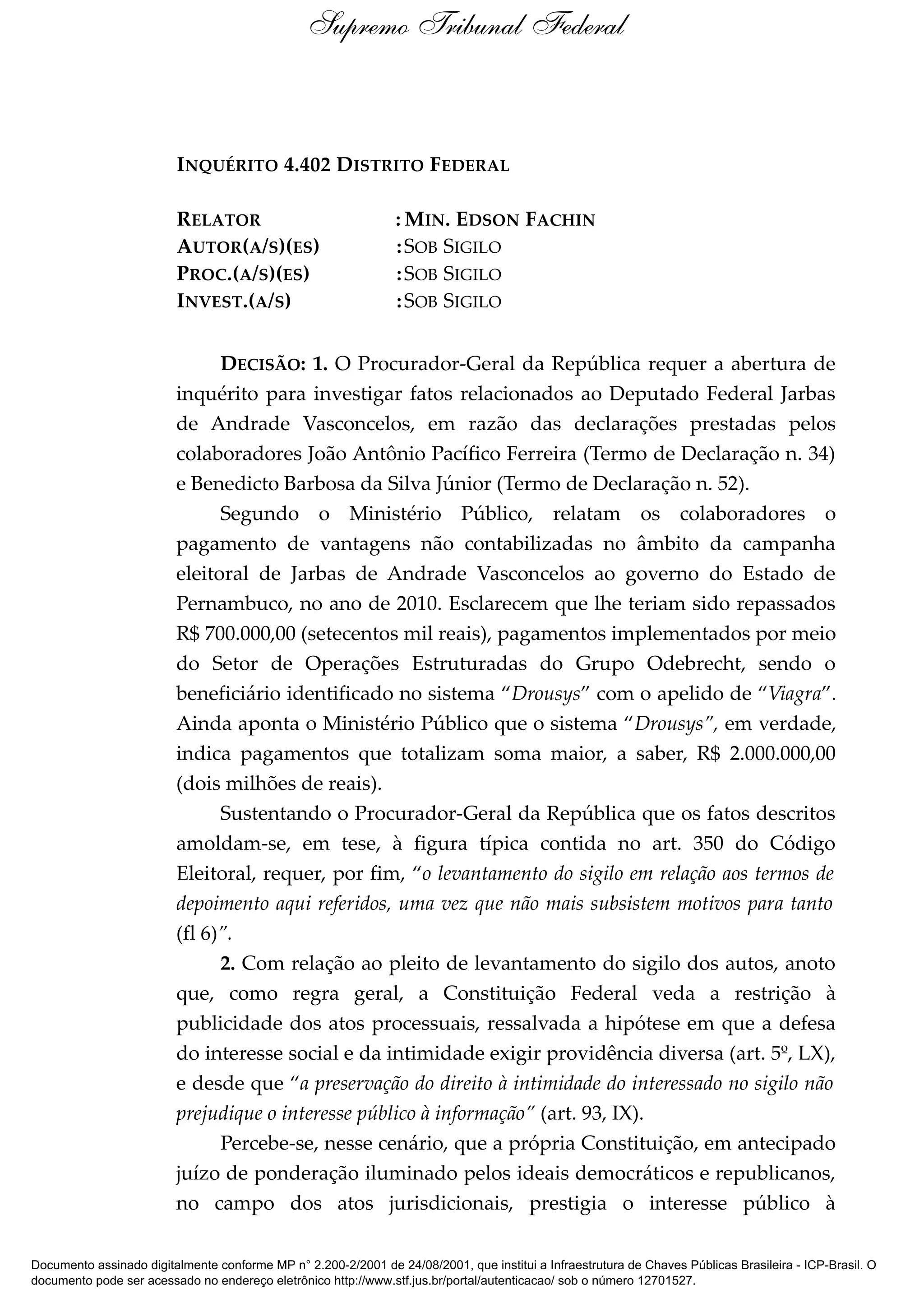 O Procurador-Geral da República requer a abertura de um inquérito para investigar pagamentos não contabilizados na campanha eleitoral de um deputado em 2010 com base nos depoimentos de colaboradores. O relator determina o levantamento do sigilo dos autos e pede manifestação sobre a extinção da punibilidade antes de decidir sobre a instauração do inquérito.
