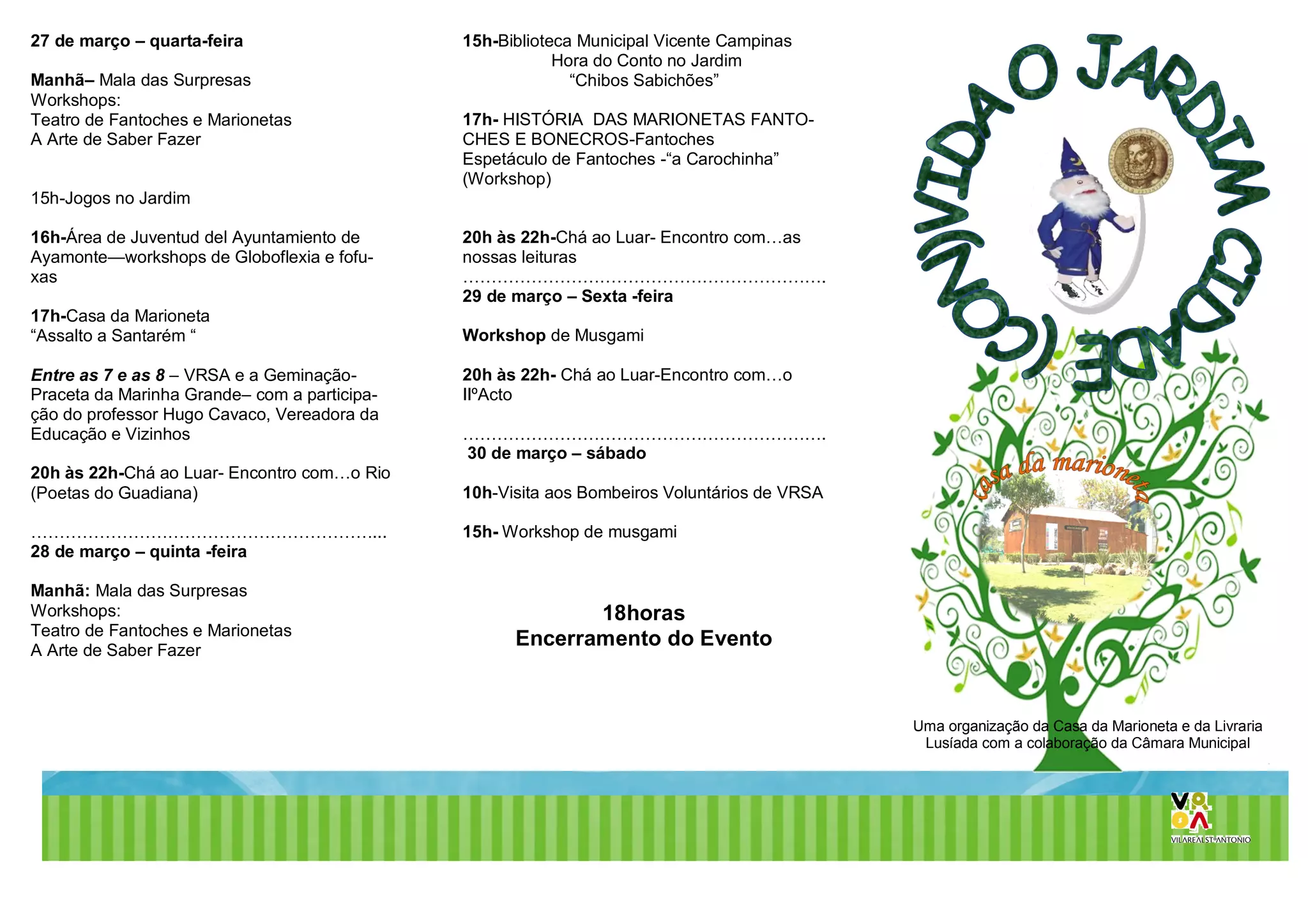 Este programa está sujeito a alterações de locais e datas, podendo consultar as mesmas através da Casa da Marioneta; facebook da Casa da Marioneta ou
