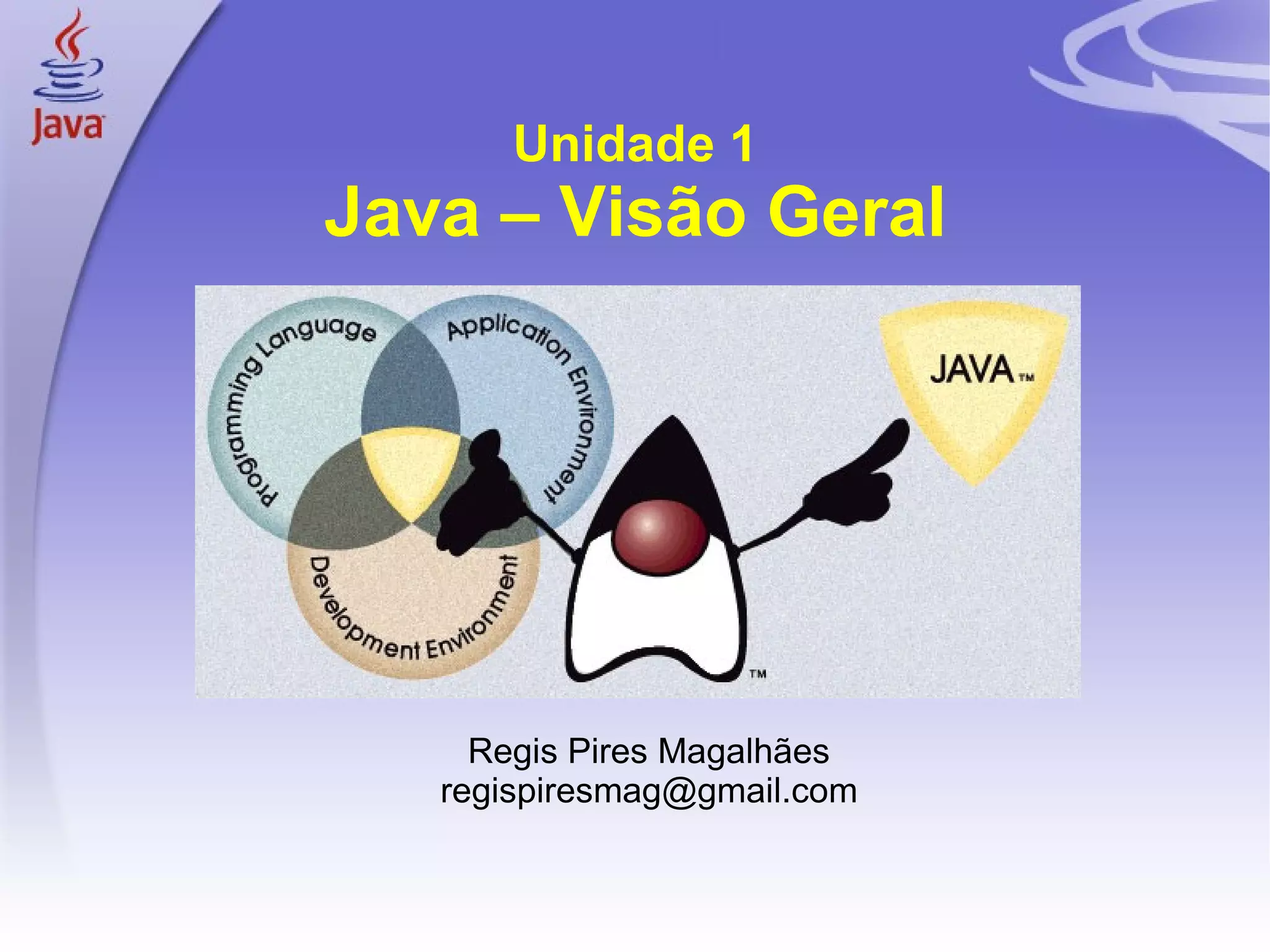 O documento fornece uma visão geral da história, características e componentes da plataforma Java. Descreve a evolução da linguagem desde seu desenvolvimento inicial em 1991 até as principais versões lançadas. Explica também os principais mitos sobre Java e ressalta suas características como orientação a objetos, independência de plataforma, segurança e desempenho.