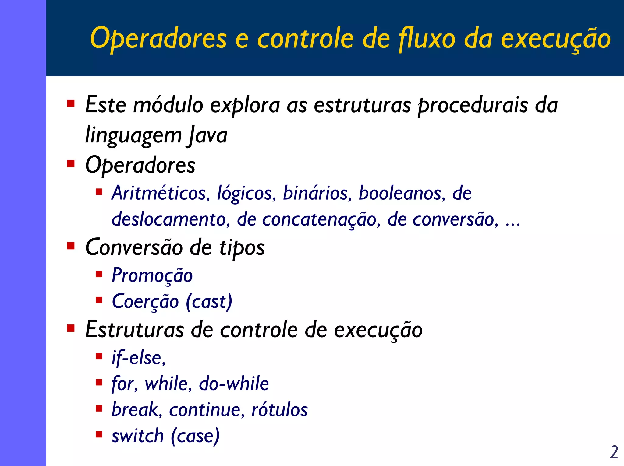 O documento discute operadores e estruturas de controle de fluxo na linguagem Java. Ele explica os diferentes tipos de operadores como aritméticos, lógicos e de atribuição, além de estruturas como if/else, for loops e switch cases. O documento também fornece detalhes sobre precedência de operadores e conversão de tipos.