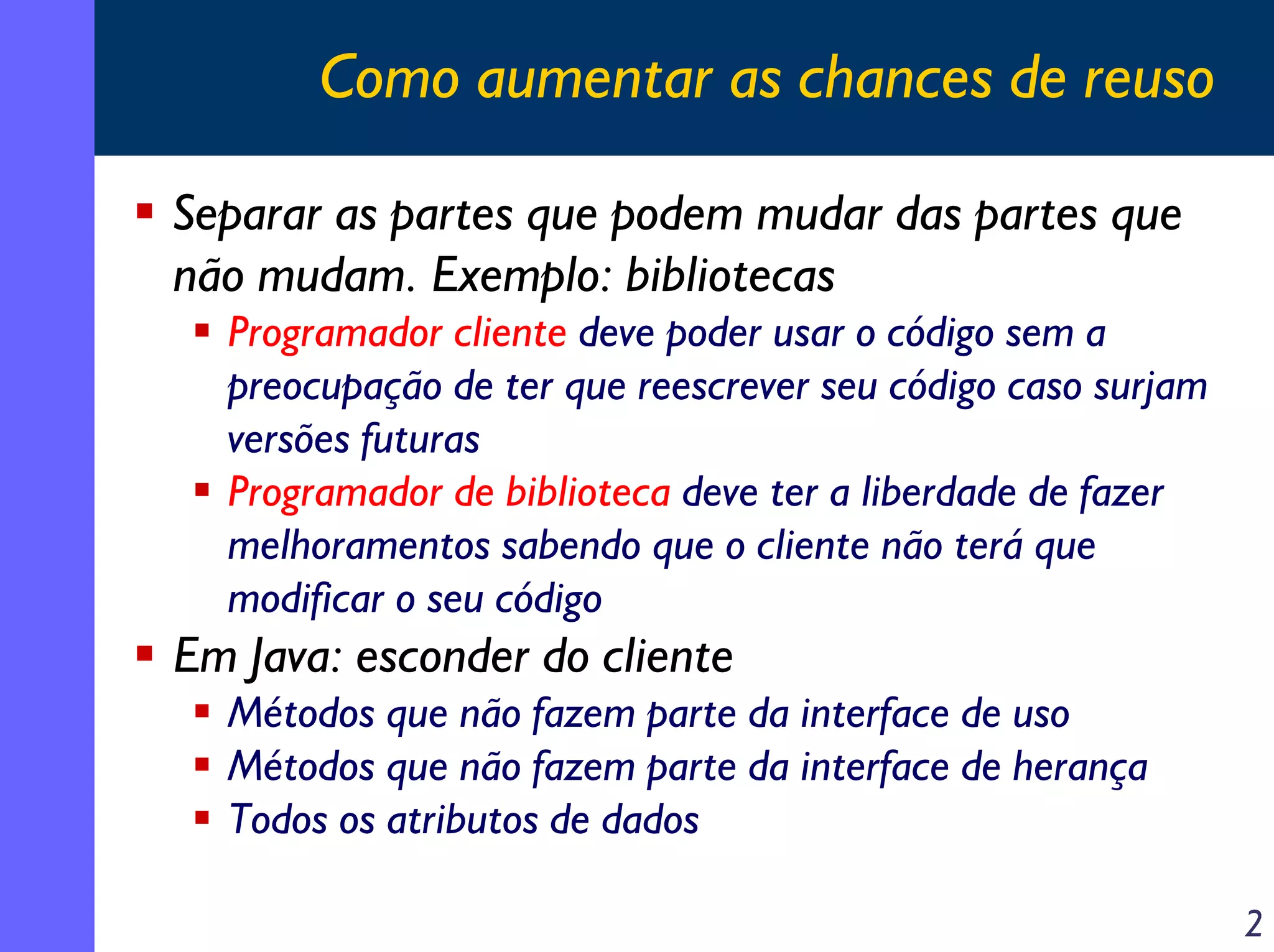 O documento discute técnicas de reuso em Java, como herança e composição. Apresenta quando usar cada uma e como implementá-las corretamente, incluindo o uso de modificadores como public, protected, private e final.