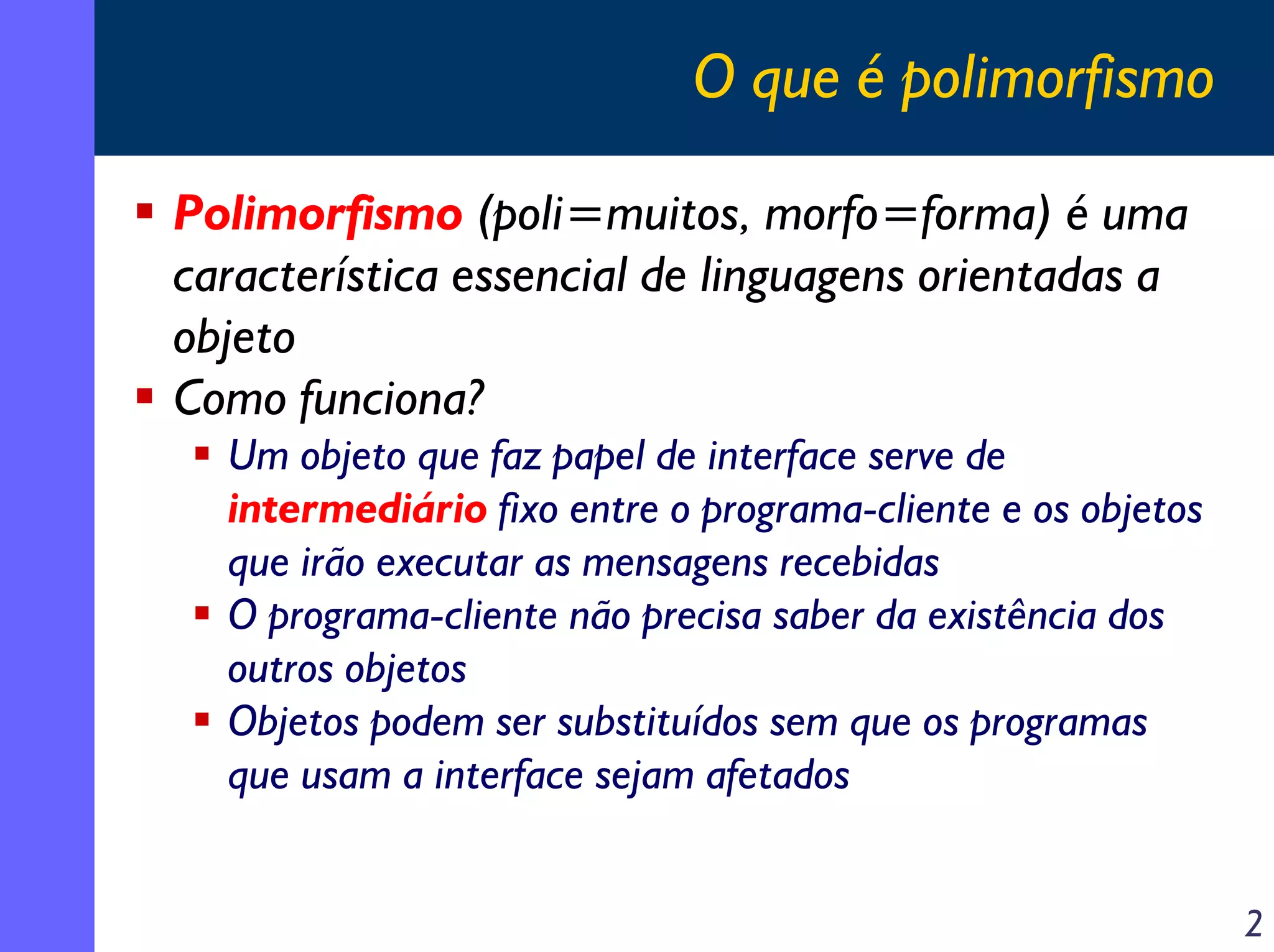 O documento aborda o conceito de polimorfismo em Java, explicando que ele permite que um objeto use diversas formas através de interfaces, facilitando a substituição e a extensão de objetos sem impactar o programa-cliente. Apresenta exemplos práticos de implementação, detalhando a diferença entre interface e implementação, e discute conceitos como métodos e classes abstratas, herança e casting. Também menciona como o polimorfismo está ligado à ligação tardia em Java, permitindo uma programação mais flexível e extensível.