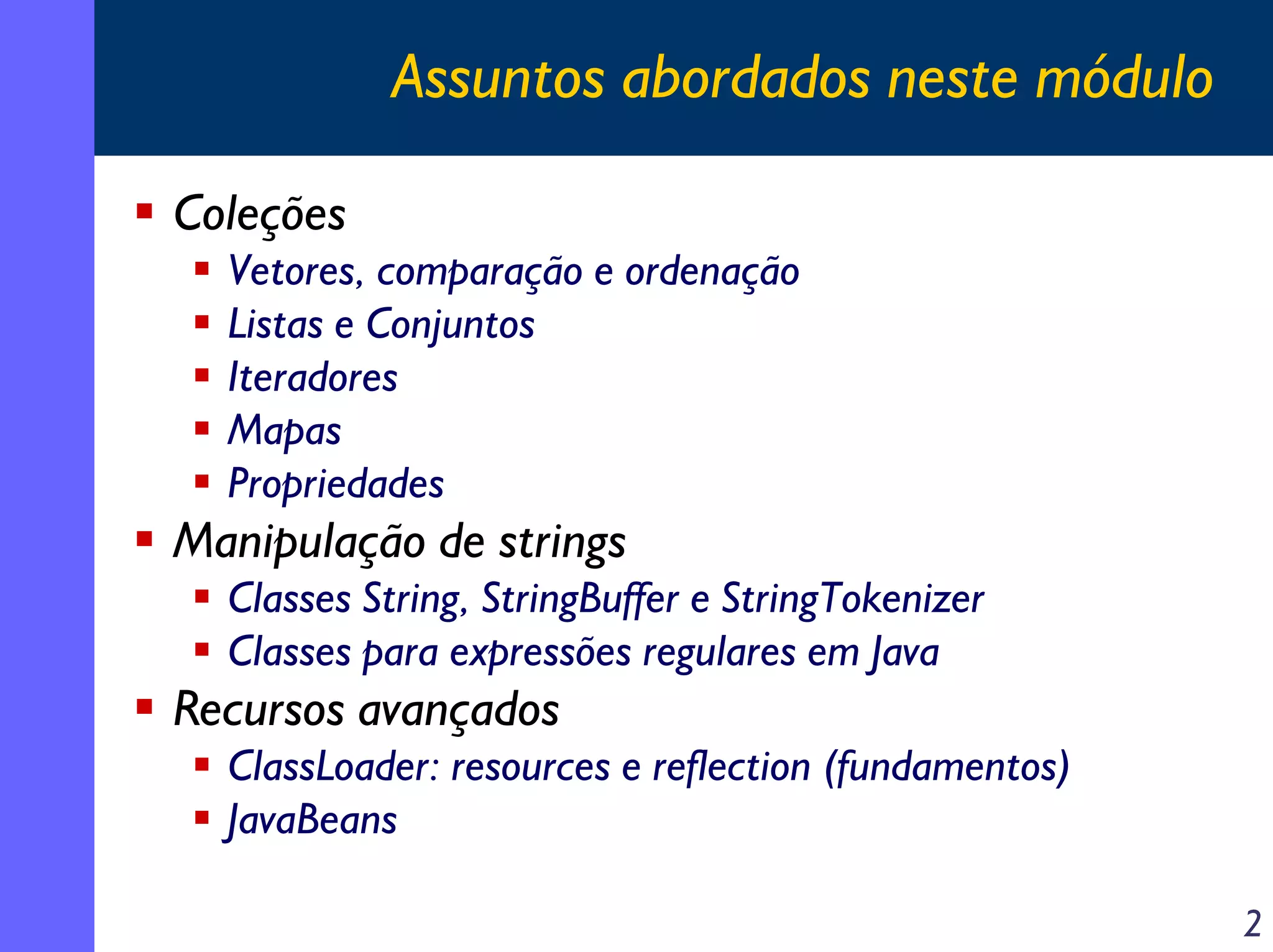 O documento discute coleções em Java, incluindo vetores, listas, conjuntos e mapas. Ele explica como manipular e ordenar coleções usando a API Collections e classes como ArrayList, LinkedList, HashSet e TreeMap. Além disso, aborda tópicos como interfaces Collection e Map, comparáveis e comparadores.