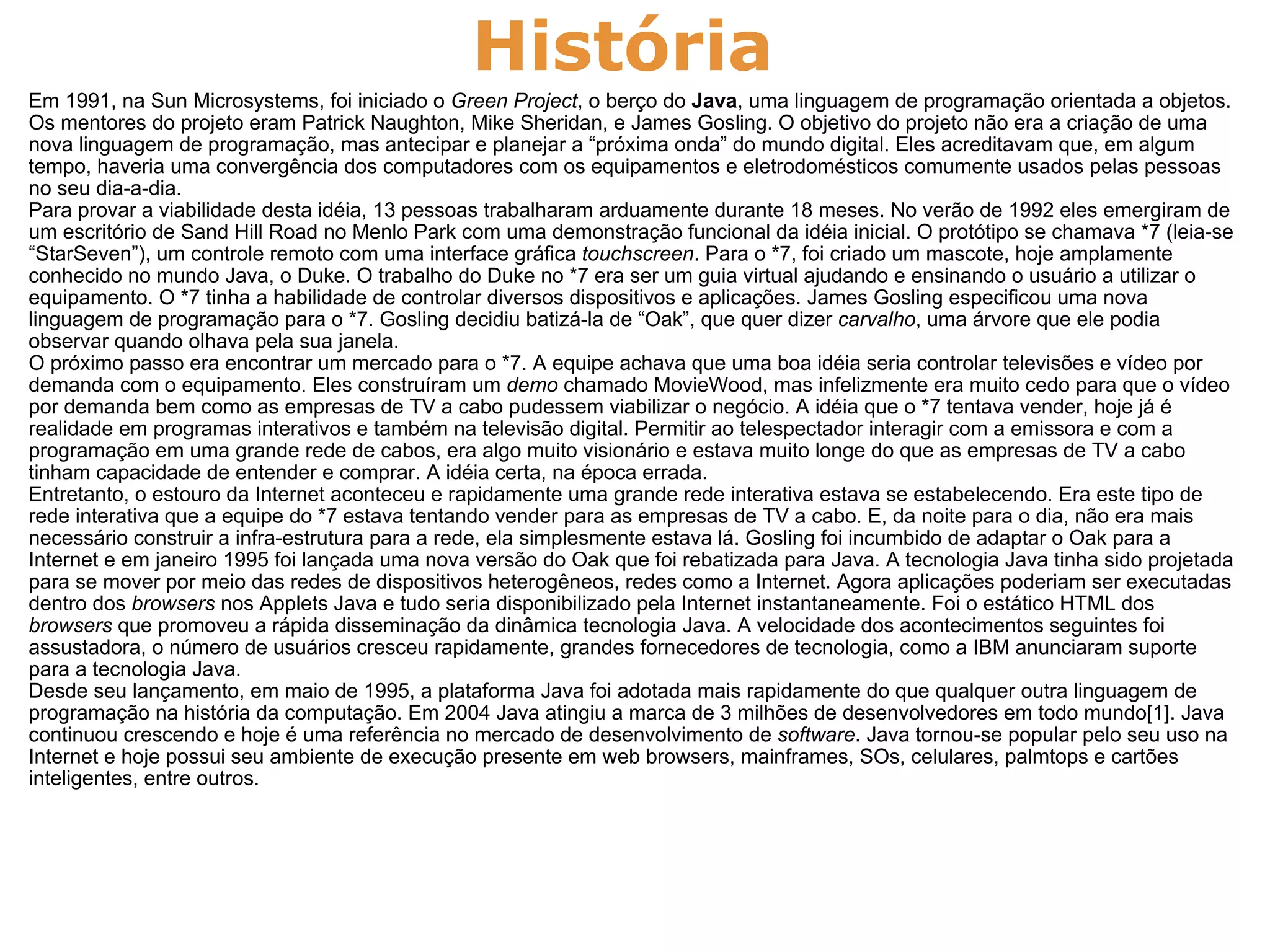 O documento descreve a história da linguagem de programação Java, desde sua criação no projeto Green pela Sun Microsystems em 1991 até seu lançamento em 1995. Foi desenvolvida inicialmente para o dispositivo *7 e depois adaptada para rodar na Internet, tornando-se popular por meio de aplicativos em navegadores.