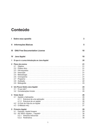 O documento apresenta informações sobre um curso introdutório sobre Java Applet, incluindo seu objetivo, público-alvo, pré-requisitos, programa, avaliação e bibliografia. Também discute conceitos básicos sobre applets e fornece um exemplo inicial de applet.