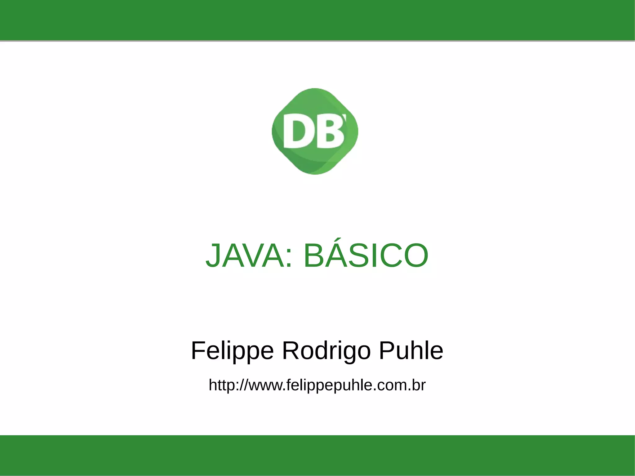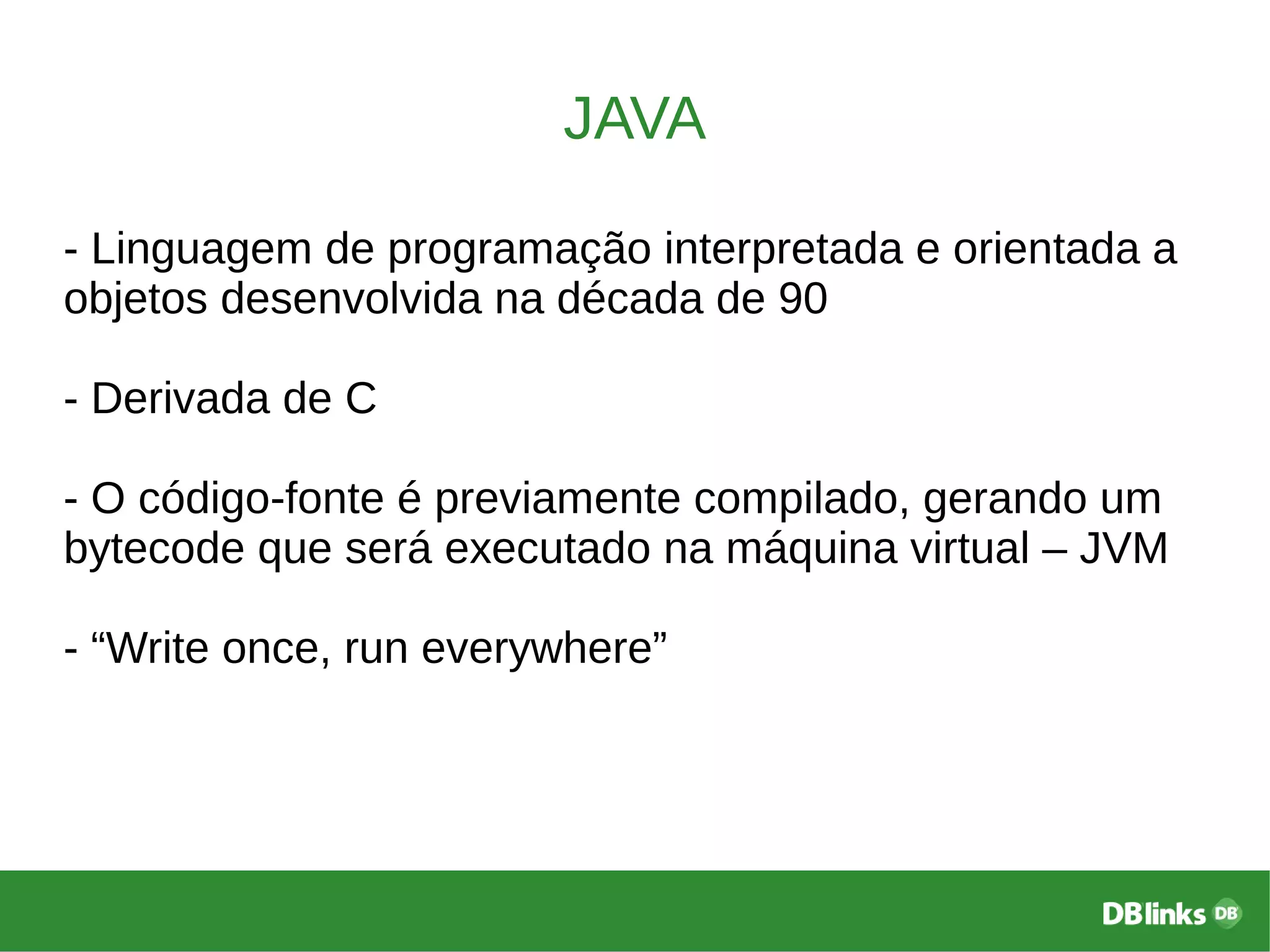 O documento descreve a linguagem de programação Java, sua arquitetura orientada a objetos, e os conceitos fundamentais como encapsulamento, herança e polimorfismo. Também cobre tipos de dados, declaração de variáveis, estruturas condicionais, e laços de repetição, apresentando exemplos em código. Por fim, menciona o método main como ponto de entrada nos programas Java.