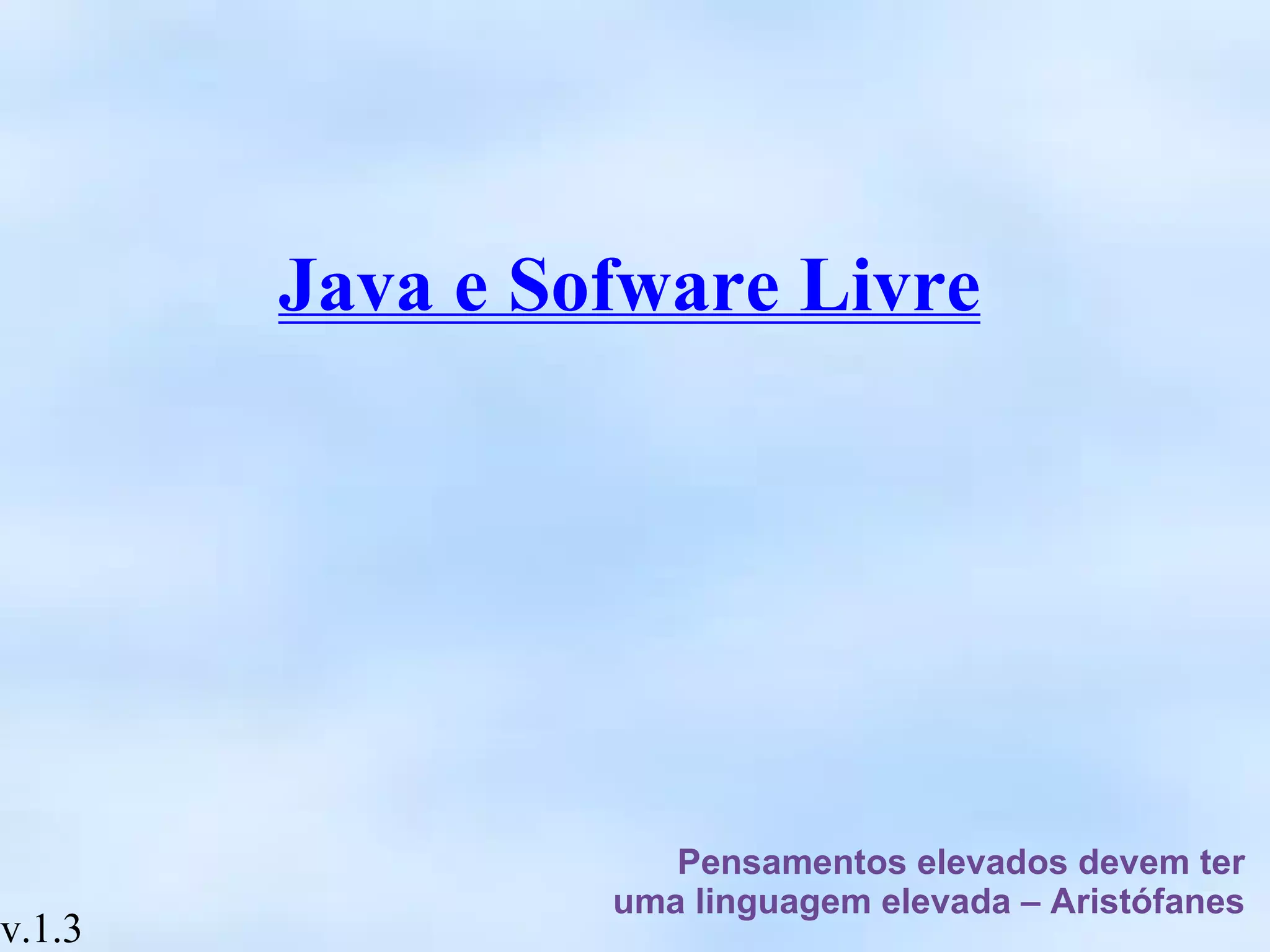 O documento discute Java como uma plataforma de desenvolvimento de software composta por máquina virtual Java, linguagem de programação Java e bibliotecas padrão, e descreve o processo Java Community Process para desenvolvimento colaborativo de especificações Java. Também aborda conceitos de software livre e projetos abertos em Java.