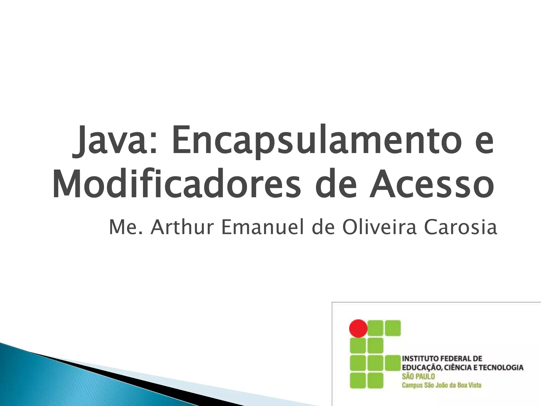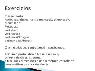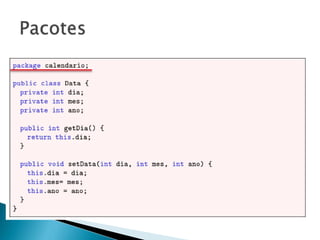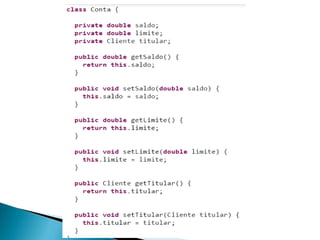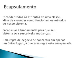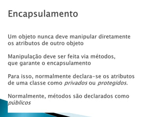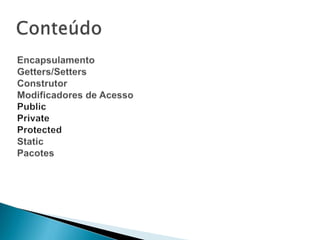 O documento discute encapsulamento e modificadores de acesso em Java, apresentando exemplos de como criar métodos get e set para recuperar e modificar atributos de uma classe, implementar construtores, e usar diferentes modificadores de acesso (público, privado, protegido). Também fornece instruções gerais sobre como modelar classes em Java.