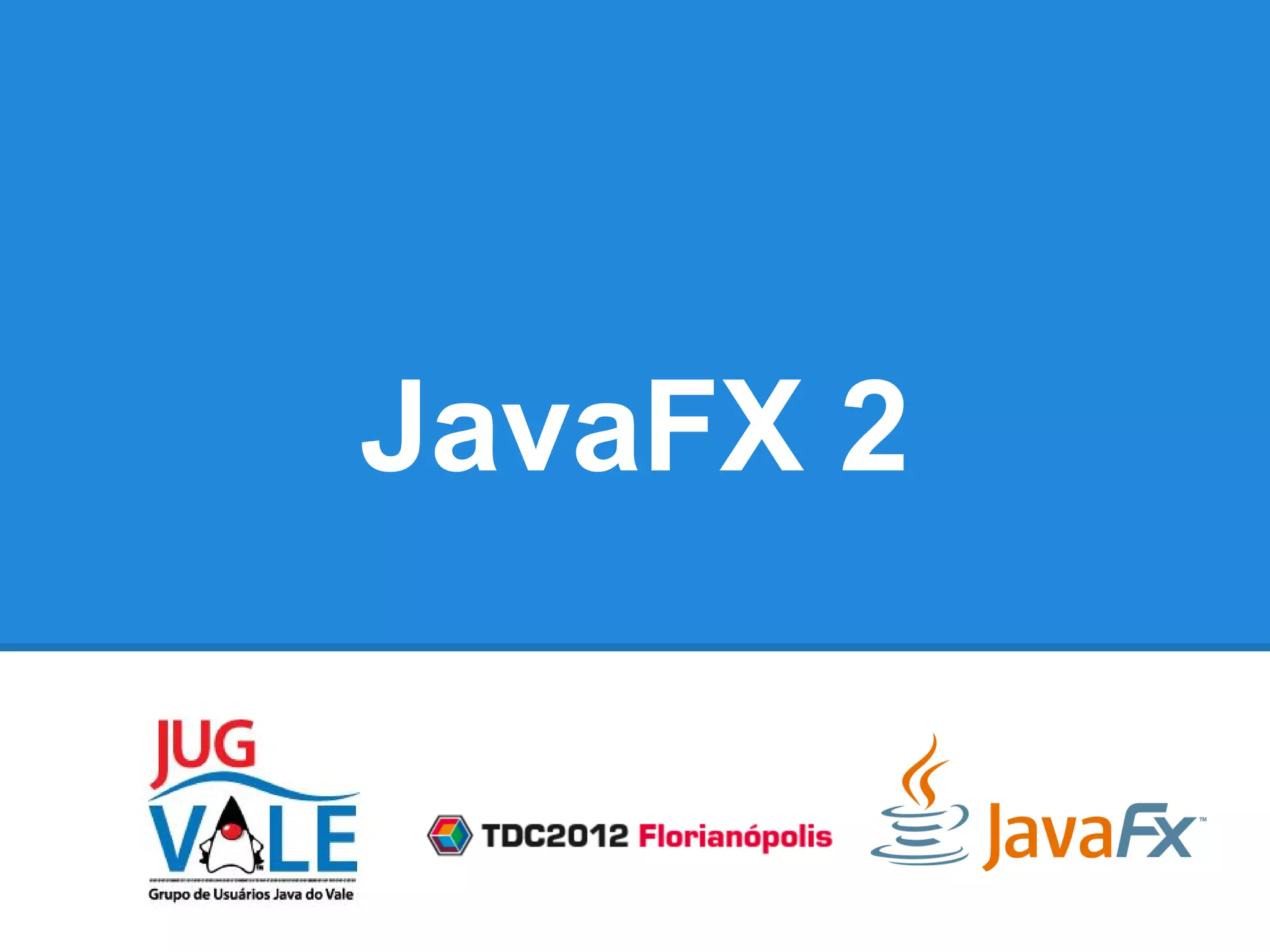 A apresentação introduz JavaFX 2, uma biblioteca Java para criação de aplicações ricas. Ela descreve o que é JavaFX 2, o que pode ser feito com ela, como ferramentas de desenvolvimento e exemplos de projetos. A apresentação também mostra um exemplo "Olá Mundo" em JavaFX 2 e discute tópicos atuais e futuros sobre a tecnologia.