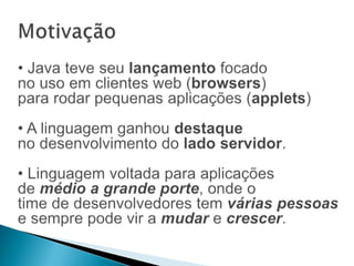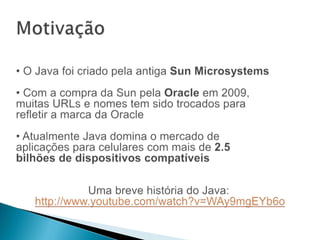 1. Java requer um código executável para cada sistema operacional através de uma máquina virtual que traduz o código para as chamadas do sistema. 2. A máquina virtual Java processa o bytecode gerado pelo compilador e é parte do ambiente de execução Java. 3. O Java Development Kit inclui ferramentas como o compilador além do ambiente de execução.