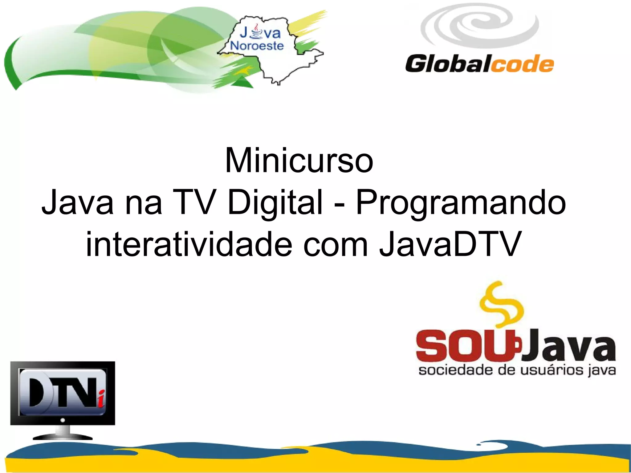 O documento apresenta um minicurso sobre programação interativa com JavaDTV, ministrado por Carlos Fernando Gonçalves, com foco em Ginga-J e o ecossistema da TV digital no Brasil. Ele aborda os padrões de TV digital, como ISDB-TB, e as especificações do middleware Ginga, além de discutir o desenvolvimento de aplicações interativas e o uso da biblioteca LWUIT. O curso também inclui informações sobre a montagem de ambientes de desenvolvimento e exemplos práticos de código.