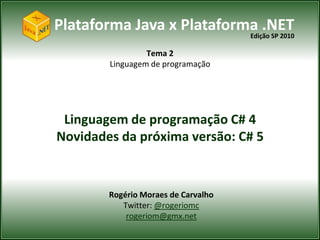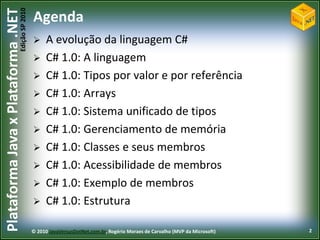 O documento discute a evolução da linguagem C# desde sua primeira versão (C# 1.0) até as novidades da próxima versão (C# 5). Ele apresenta os principais recursos introduzidos em cada versão como generics, LINQ, objetos dinâmicos e compilador como serviço.