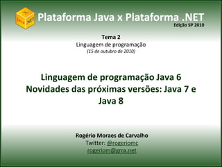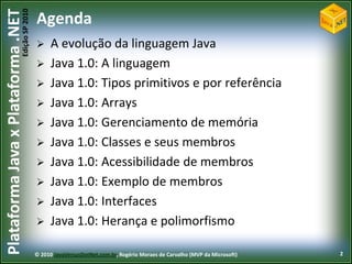 Este documento apresenta a agenda de uma palestra sobre a evolução da linguagem de programação Java. A agenda inclui tópicos como as principais versões da linguagem Java desde a versão 1.0, características introduzidas em cada versão como classes aninhadas e generics, e as novidades planejadas para as versões Java 7 e Java 8 como suporte a linguagens dinâmicas e projeto lambda.