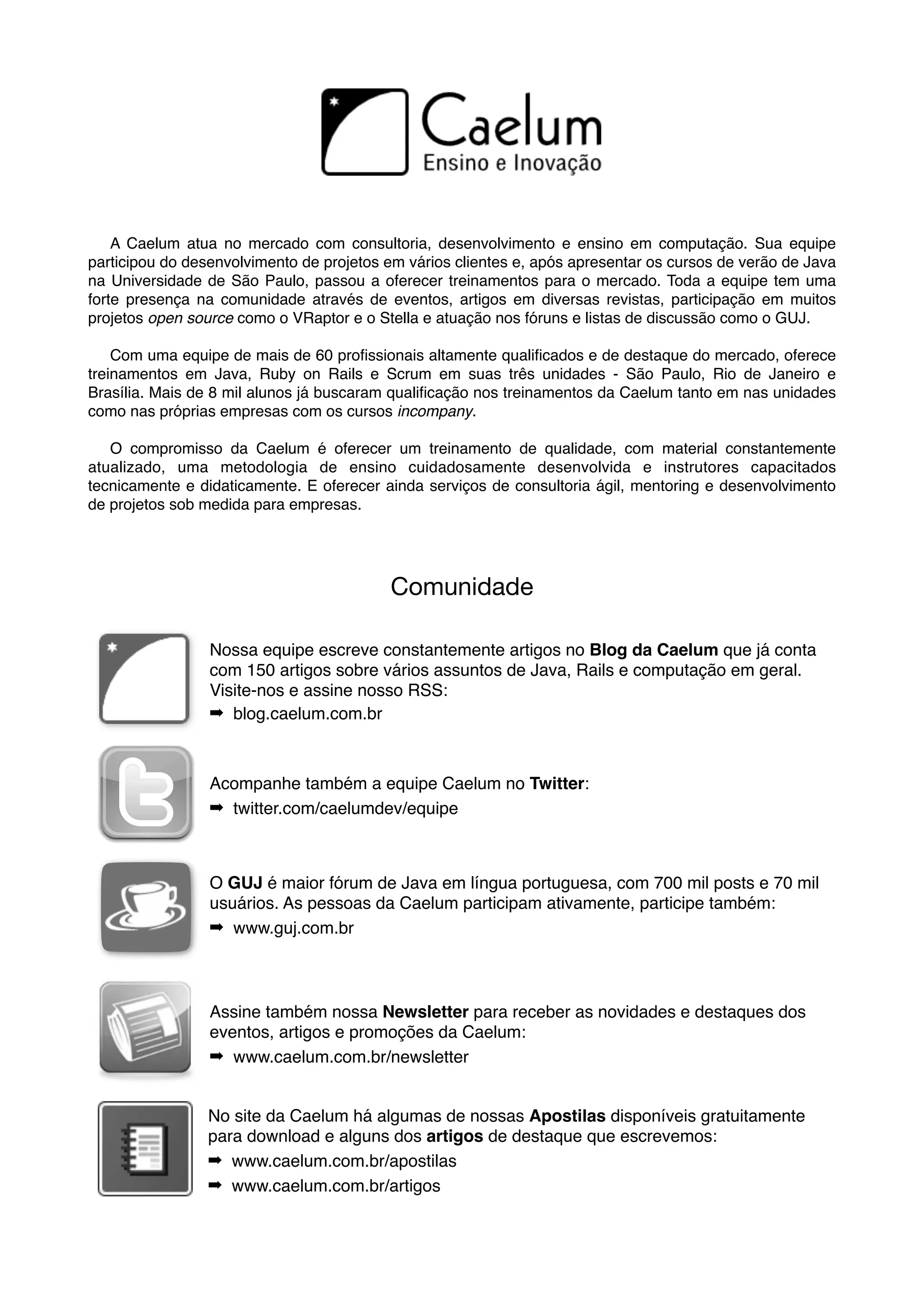 A Caelum é uma empresa de consultoria, treinamento e ensino em computação com foco em Java, Ruby on Rails e Scrum. A empresa oferece treinamentos presenciais e online em suas unidades em São Paulo, Rio de Janeiro e Brasília para mais de 8 mil alunos. A Caelum também fornece serviços de consultoria ágil, mentoria e desenvolvimento de projetos personalizados para empresas.