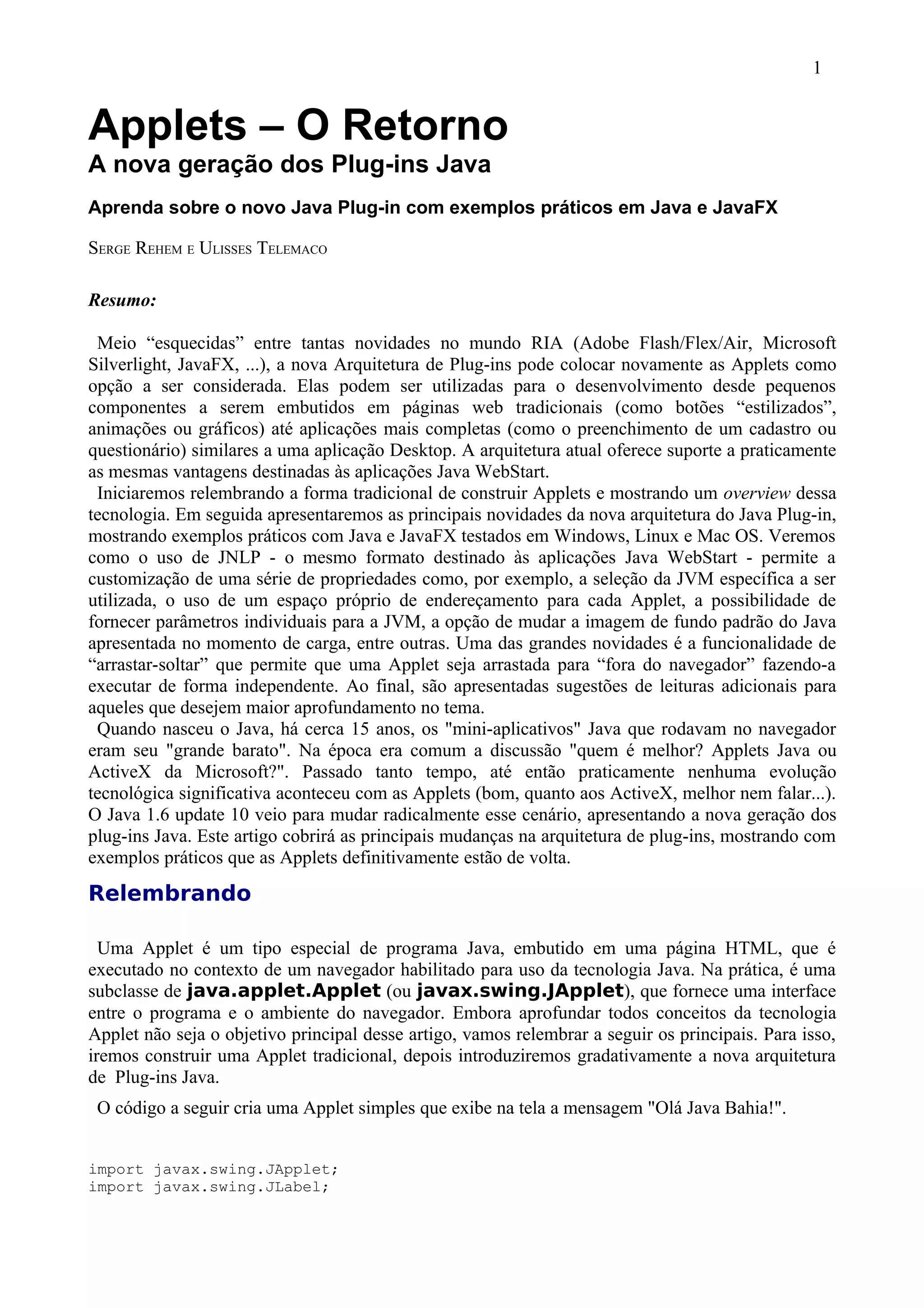 O documento discute o retorno das applets Java com a nova arquitetura do plug-in Java, que promete resolver limitações anteriores e melhorar a confiabilidade ao isolar a JVM do navegador. Além de apresentar exemplos práticos de uso, aborda novidades como suporte a JNLP, arrastar e soltar applets, e uma integração aprimorada com JavaScript. O artigo também explora a configuração do navegador para suportar a nova geração de plug-ins Java.