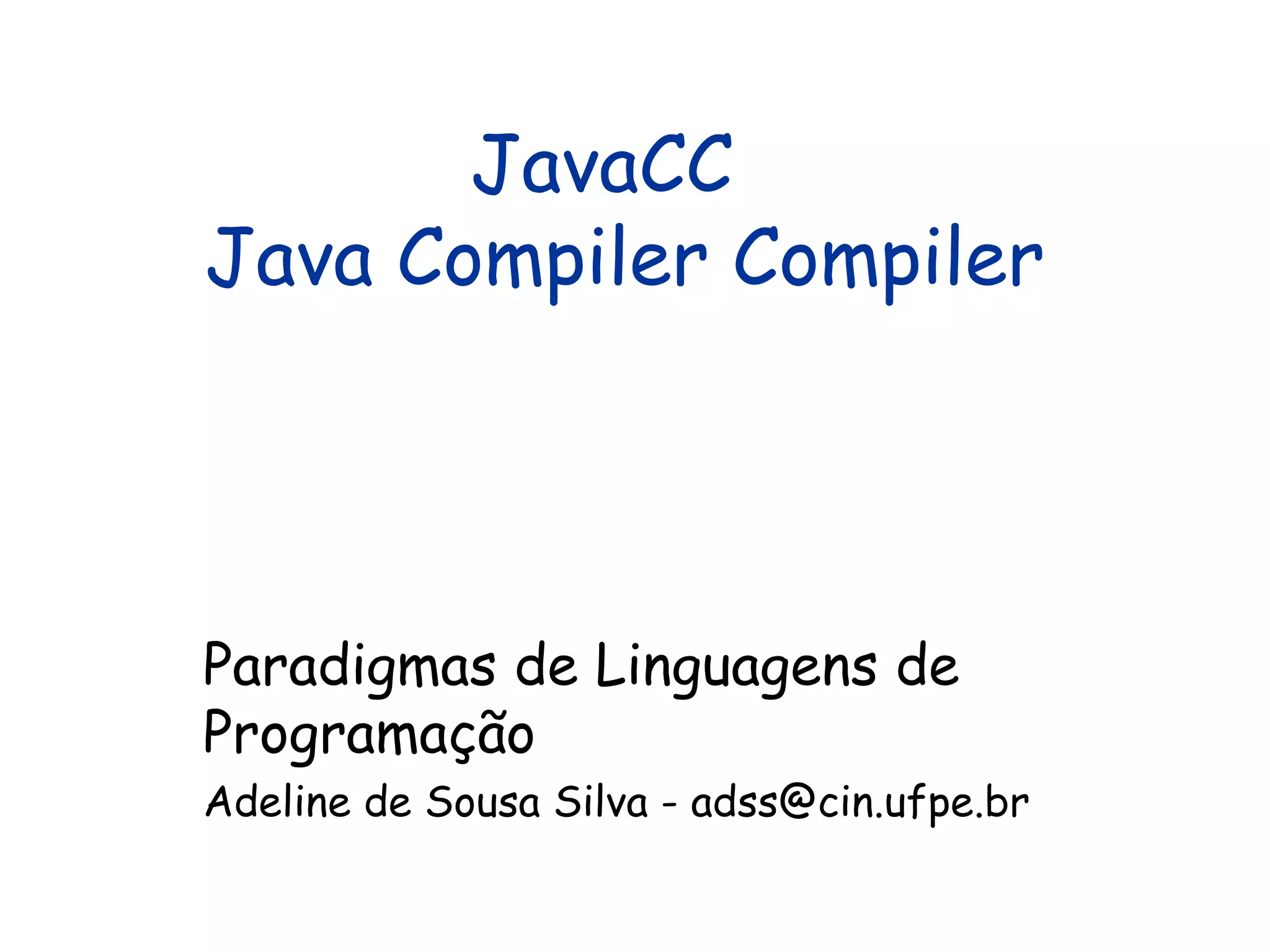 O documento descreve o Java Compiler Compiler (JavaCC), um gerador de parsers para a linguagem Java. JavaCC recebe como entrada uma especificação de gramática e gera um parser para reconhecer aquela gramática. Explica como escrever gramáticas no formato JavaCC, incluindo definições léxicas, produções e ações semânticas.