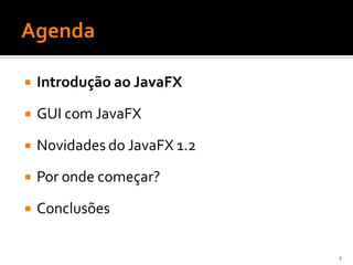 O documento apresenta uma introdução ao JavaFX, detalhando suas funcionalidades para criação de interfaces gráficas, novidades da versão 1.2 e fundamentos da linguagem. Além disso, discute a integração com Java, performance, distribuição de aplicativos e oferece exemplos de código. O autor aponta tanto as vantagens quanto as desvantagens do uso do JavaFX em comparação com outras tecnologias, como o Swing.
