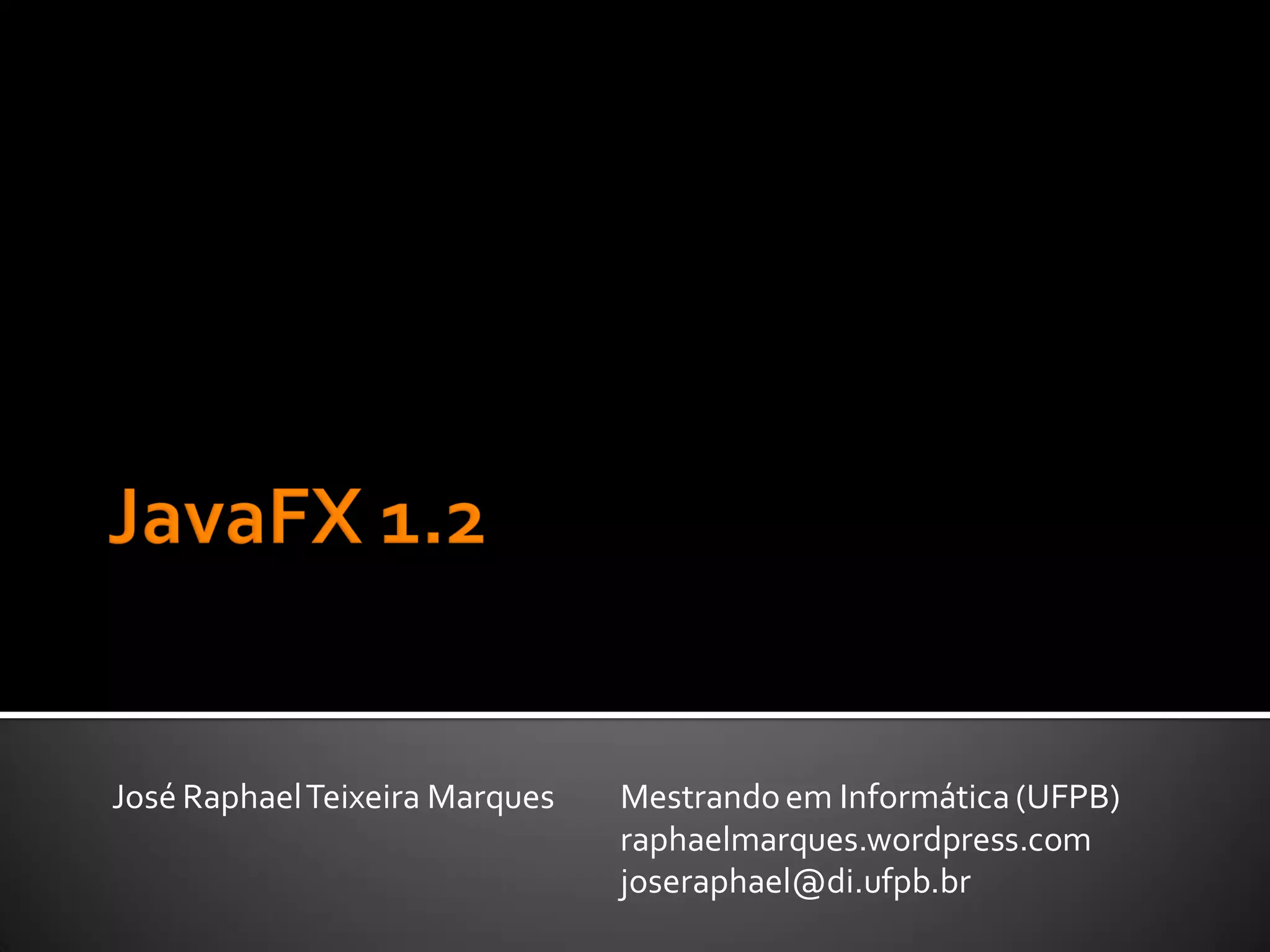O documento apresenta uma introdução ao JavaFX, detalhando suas funcionalidades para criação de interfaces gráficas, novidades da versão 1.2 e fundamentos da linguagem. Além disso, discute a integração com Java, performance, distribuição de aplicativos e oferece exemplos de código. O autor aponta tanto as vantagens quanto as desvantagens do uso do JavaFX em comparação com outras tecnologias, como o Swing.