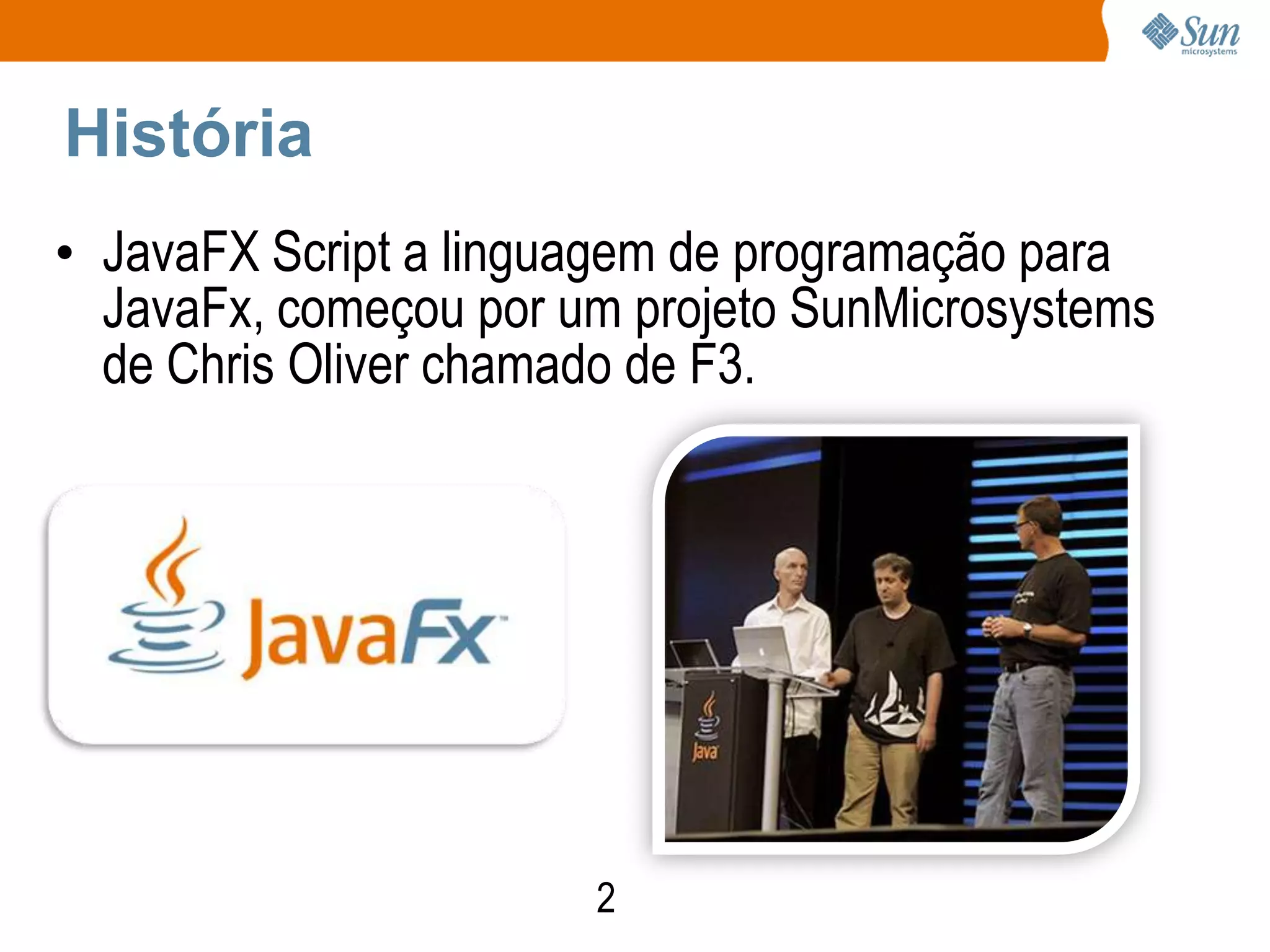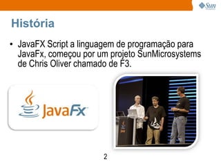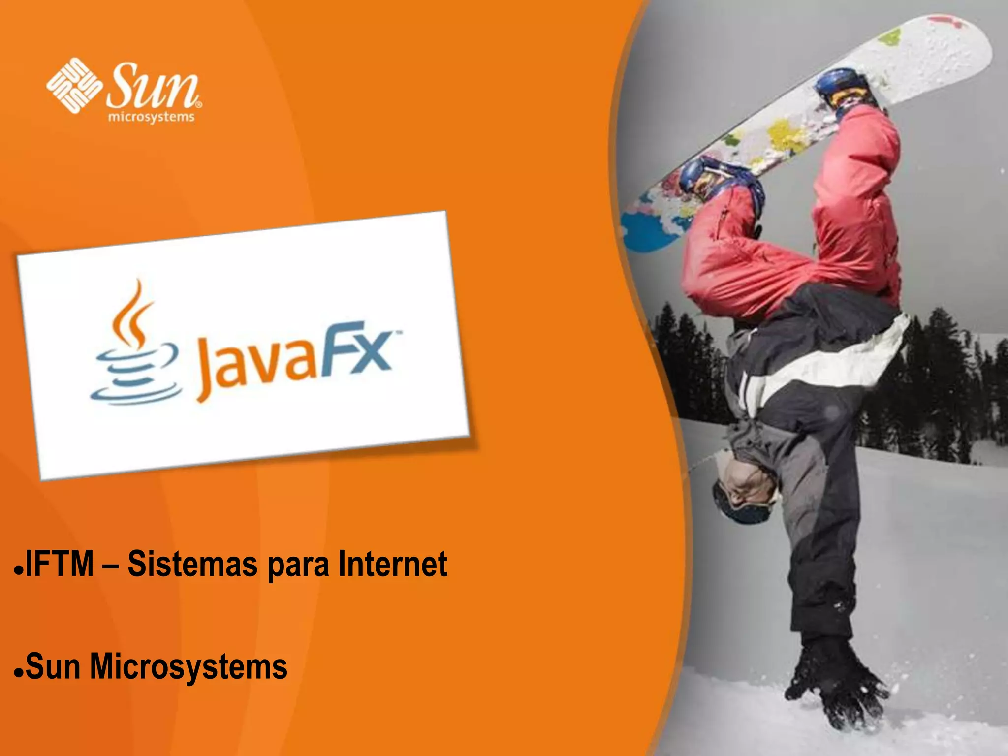 O documento resume o que é JavaFX, incluindo sua história, propósito e produtos. JavaFX é uma plataforma da Sun Microsystems para desenvolvimento de aplicações ricas para a internet, concorrendo com Adobe Flex e Microsoft Silverlight. Os produtos são JavaFX Mobile para dispositivos móveis e JavaFX Script, uma linguagem de programação.