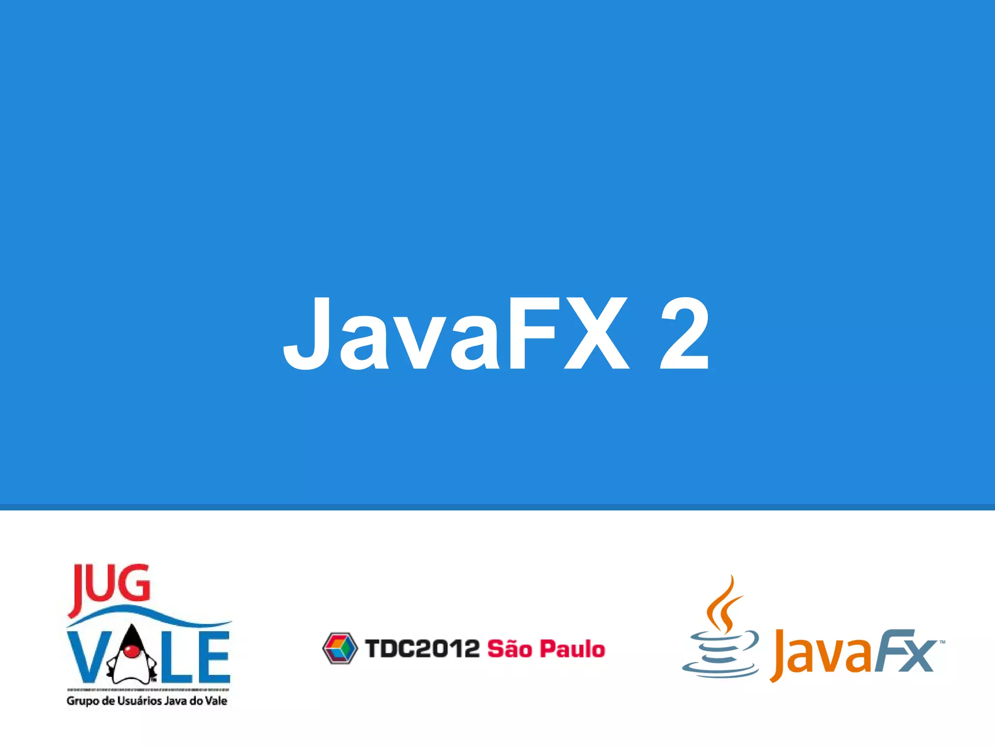 O documento apresenta JavaFX 2, uma biblioteca Java para criação de aplicações ricas. Apresenta o que é JavaFX 2, o que pode ser feito com ela como criar interfaces gráficas, aplicar efeitos, animações, mostrar páginas HTML e gráficos. Demonstra ferramentas como Scene Builder e projetos como FXForm2 e ScalaFX, e mostra um exemplo simples de "Olá Mundo" em JavaFX 2.